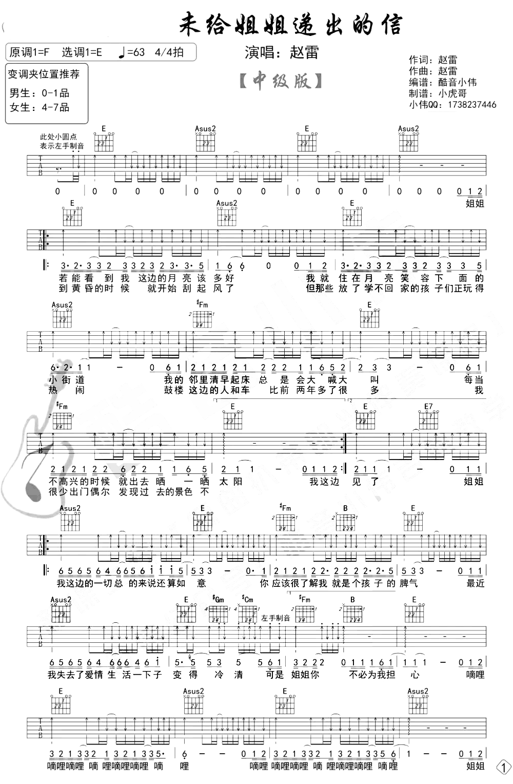 曲谱介绍: 赵雷《未给姐姐递出的信》,一首亲切的民谣歌曲,叙事般的创作走势纯粹而又走心,放不下的是对亲人的思念,更是姐姐无尽的担忧与牵绊,你在他乡还好吗? 未给姐姐递出的信吉他谱,中级版编配,E调指法编配,原调F调,建议变调夹1品弹唱原调,随谱附本谱的吉他弹唱演示+教学视频,琴友们可以跟着酷音小伟老师的演示一同练习。