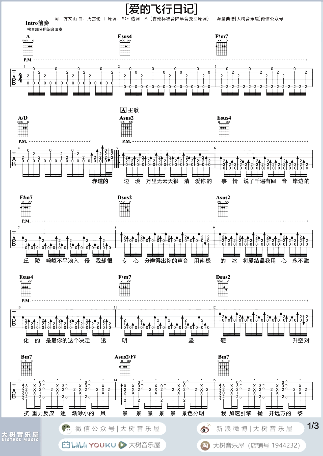 曲谱介绍: 《爱的飞行日记》吉他弹唱教学 爱的飞行日记吉他谱,方文山作词,周杰伦作曲并演唱的轻快浪漫情歌,爱的余味就好比插上双翼在满天飞行,律动感的节奏,让我们不由自主的心率上升。 《爱的飞行日记》吉他弹唱谱,超原版编配,选用A调,原调#G,标准调音降半音弹唱原调,含完整前奏,扫弦节拍是这首歌的关键,大家可参照弹唱演示+教学视频跟随老师一同练习。