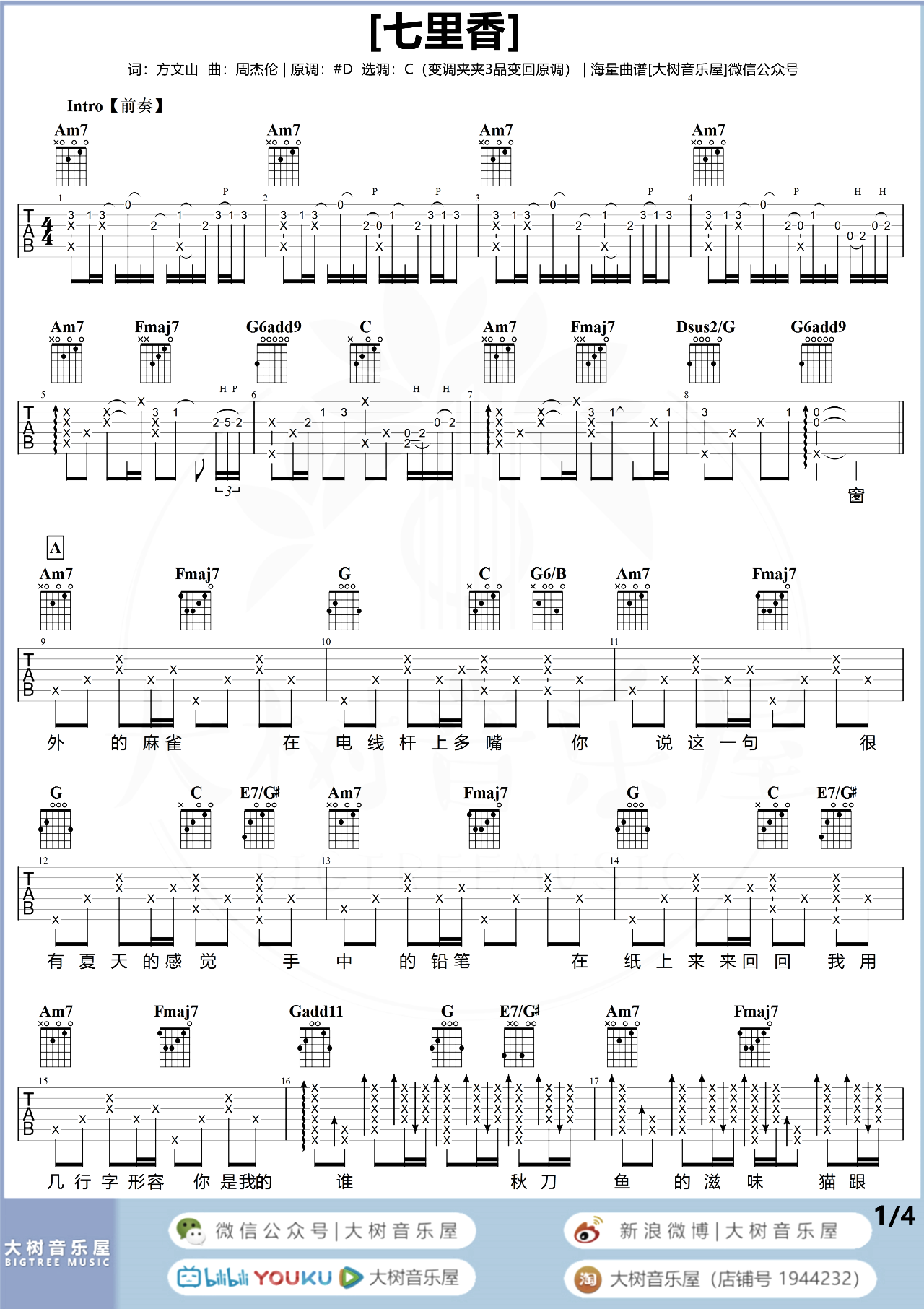 曲谱介绍: 《七里香》吉他弹唱教学 旧时光总要和好听的音乐相伴,周董慵懒式的情歌从《七里香》逐渐便变成了一代人的记忆,歌曲除了让我们体会到优雅的弦乐,甜蜜浓郁的初恋,复杂的层次感同样也表达着一种热情奔放的心情,那种感觉仿佛让我们可以安静地沉入夏天的海水里,想要让自己慢慢沉落下去却又渴望被人救赎的感觉。 七里香吉他谱,周杰伦的经典情歌,超原版编配,共四张高清六线谱,选用C调,原调#D,建议变调夹夹3品弹唱原调,本谱含歌曲原版的前奏,弹唱有一定难度,随谱已附《七里香》演示+教学视频,可供大家参考。