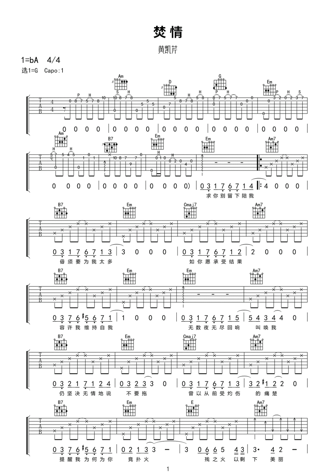 焚情吉他谱 - 黄凯芹 - G调吉他弹唱谱 - 原版