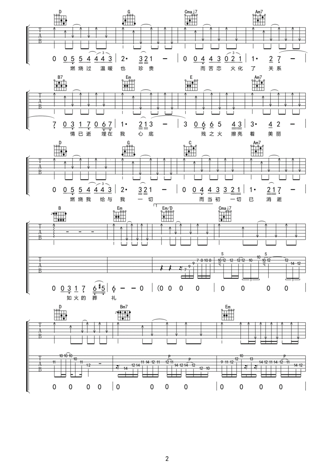 曲谱介绍: 吉他谱介绍:焚情吉他谱,黄凯芹演唱的一首歌曲,4/4拍的节奏,这首歌曲的原调为降A调,这里曲谱采用了G调指法进行编配,演唱时夹变调夹1品可回到原调,也可根据个人实际嗓音情况选择。曲谱由琴谱网更新上传,共4张高清图片弹唱吉他谱例,曲谱来源于网络转载,编配制谱者暂不详。这首歌的前奏是经典粤语歌里富有怀旧情调的伴奏,让人一听便像回到了那个年代,而歌曲本身的歌词也是写的十分感人。