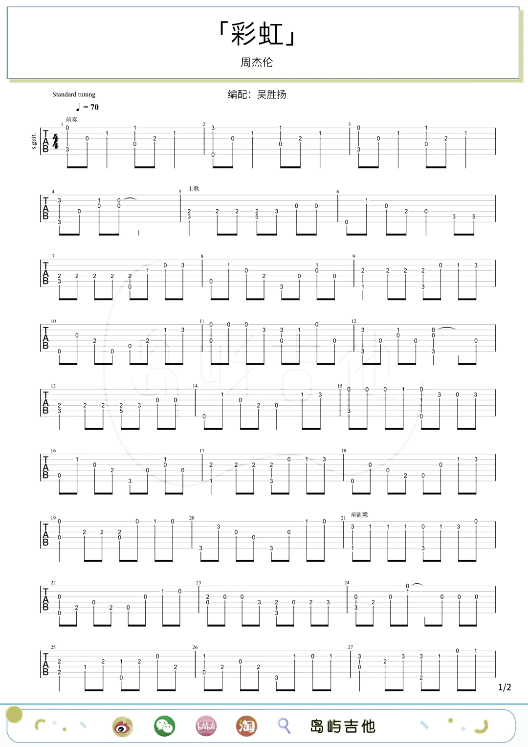 曲谱介绍: 彩虹指弹吉他谱,根据周杰伦的经典情歌《彩虹》而改编的指弹曲目,共有两张高清PNG图片谱,速度70拍每分钟,节奏4/4拍,随谱附《彩虹》吉他指弹演示+教学视频,建议大家参照后练习,本谱难度比较适合刚刚入门指弹的琴友练习,相对较简单。