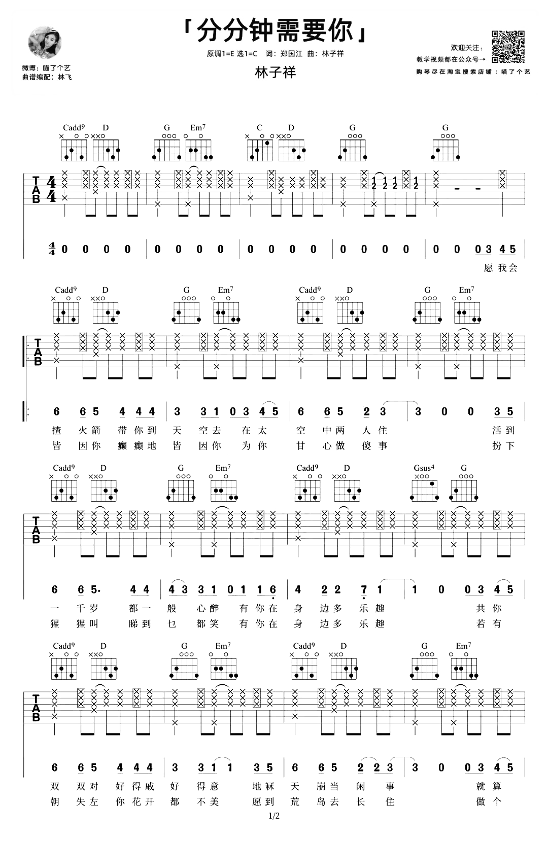 曲谱介绍: 分分钟需要你吉他谱,林子祥原唱,最近超火的一首甜蜜粤语老歌,甚至频繁的出现在恋综和一些节目之中,轻松的节奏之下只有浪漫,没有烦恼忧愁,在520这个节日之中,送给有心人,唱给最爱的TA听。 《分分钟需要你》吉他弹唱谱,选用C调,原调E调,建议变调夹夹4品弹唱原调,本谱为抓弦+拍弦的节奏形式,随谱附琴友的吉他演示视频,供大家参照练习。