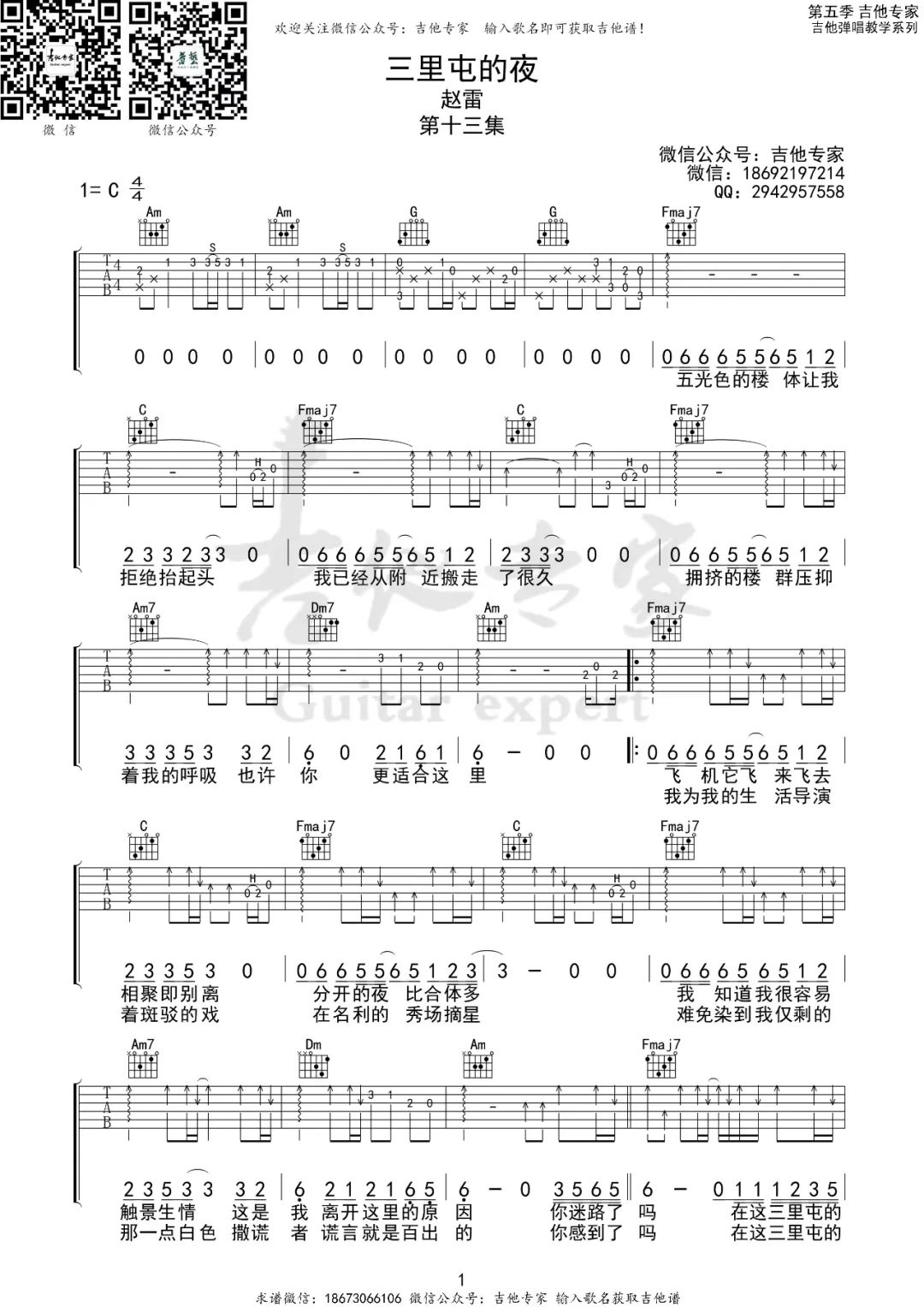 曲谱介绍: 吉他谱介绍:三里屯的夜吉他谱,赵雷演唱的一首歌曲,4/4拍的节奏,这首歌曲的原调为C调,这里曲谱采用了C调指法进行编配,演唱时可不夹变调夹,曲谱由琴谱网更新上传,共2张高清图片弹唱吉他谱例,来源于@吉他专家编配出品。赵雷唱出了当下的心境。灯红酒绿,名利繁华,很容易让人迷失自己。如今的赵雷,已经不是那个穷哈哈的小子,他看过了繁华,如果想要,名利也是随手可得,但是这些东西会玷染了内心的纯粹。