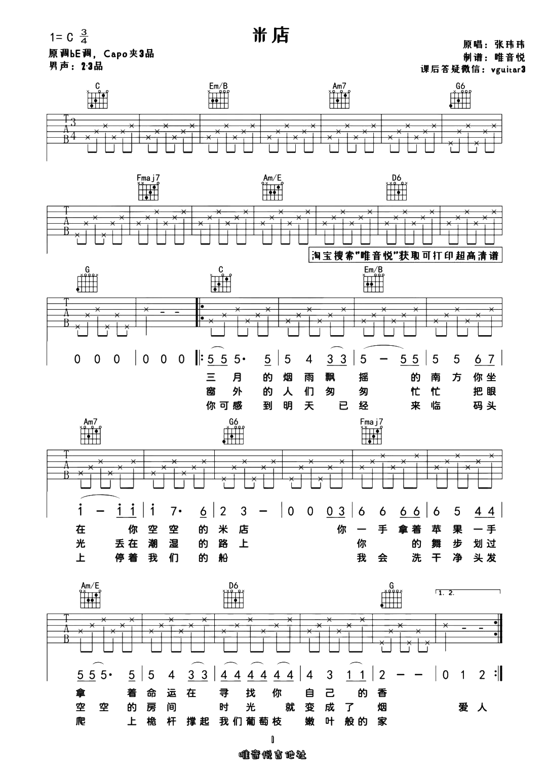 米店吉他谱 - 张玮玮 - C调吉他弹唱谱