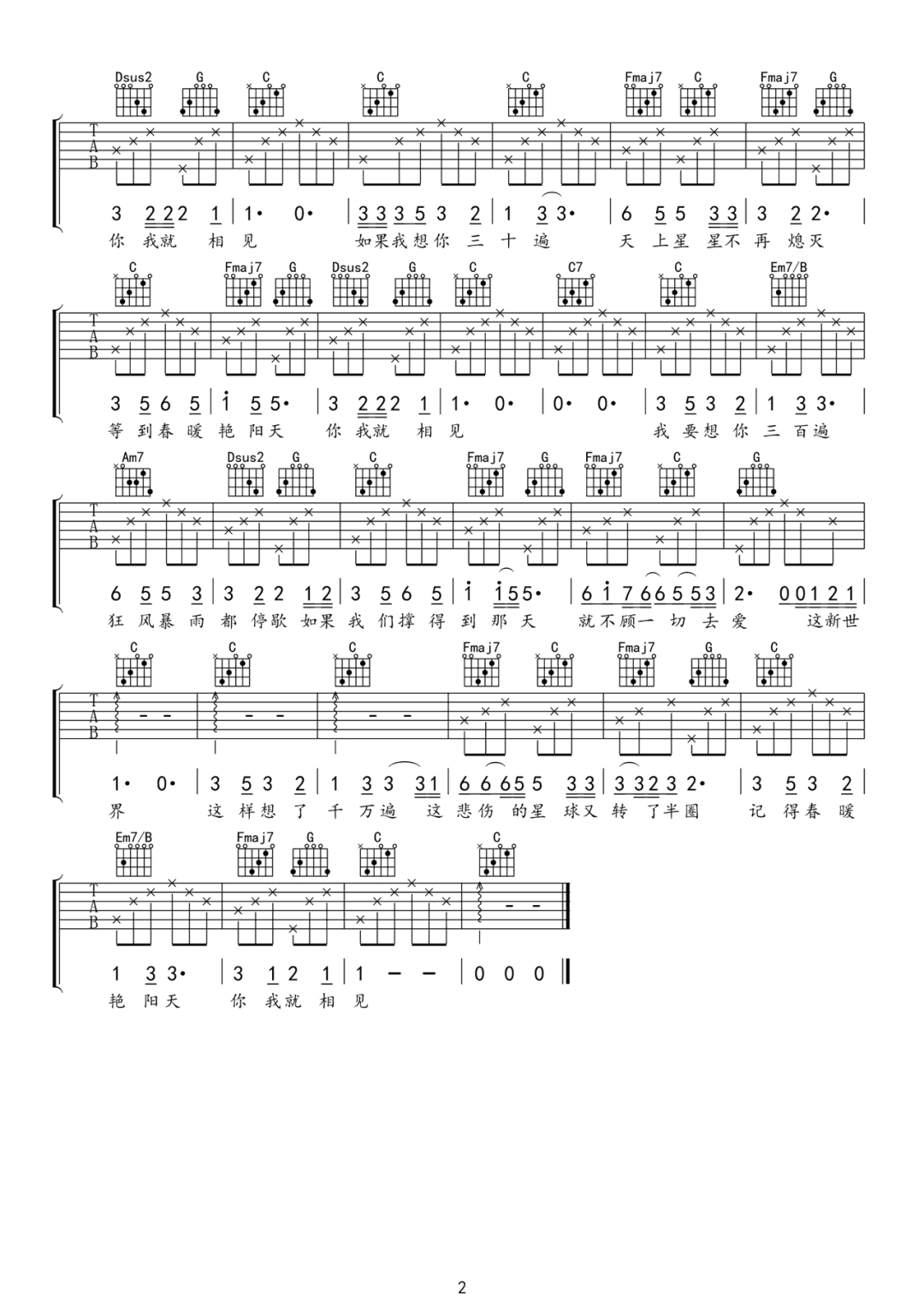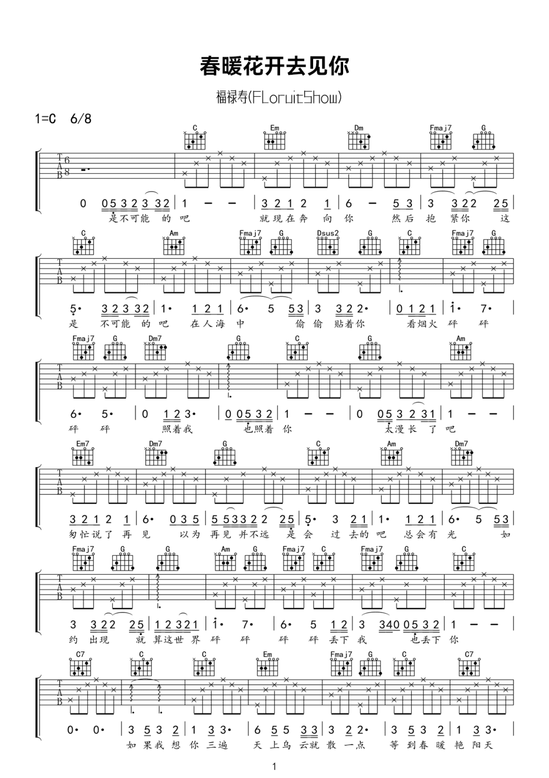 春暖花开去见你吉他谱 - 福禄寿FloruitShow - C调吉他弹唱谱