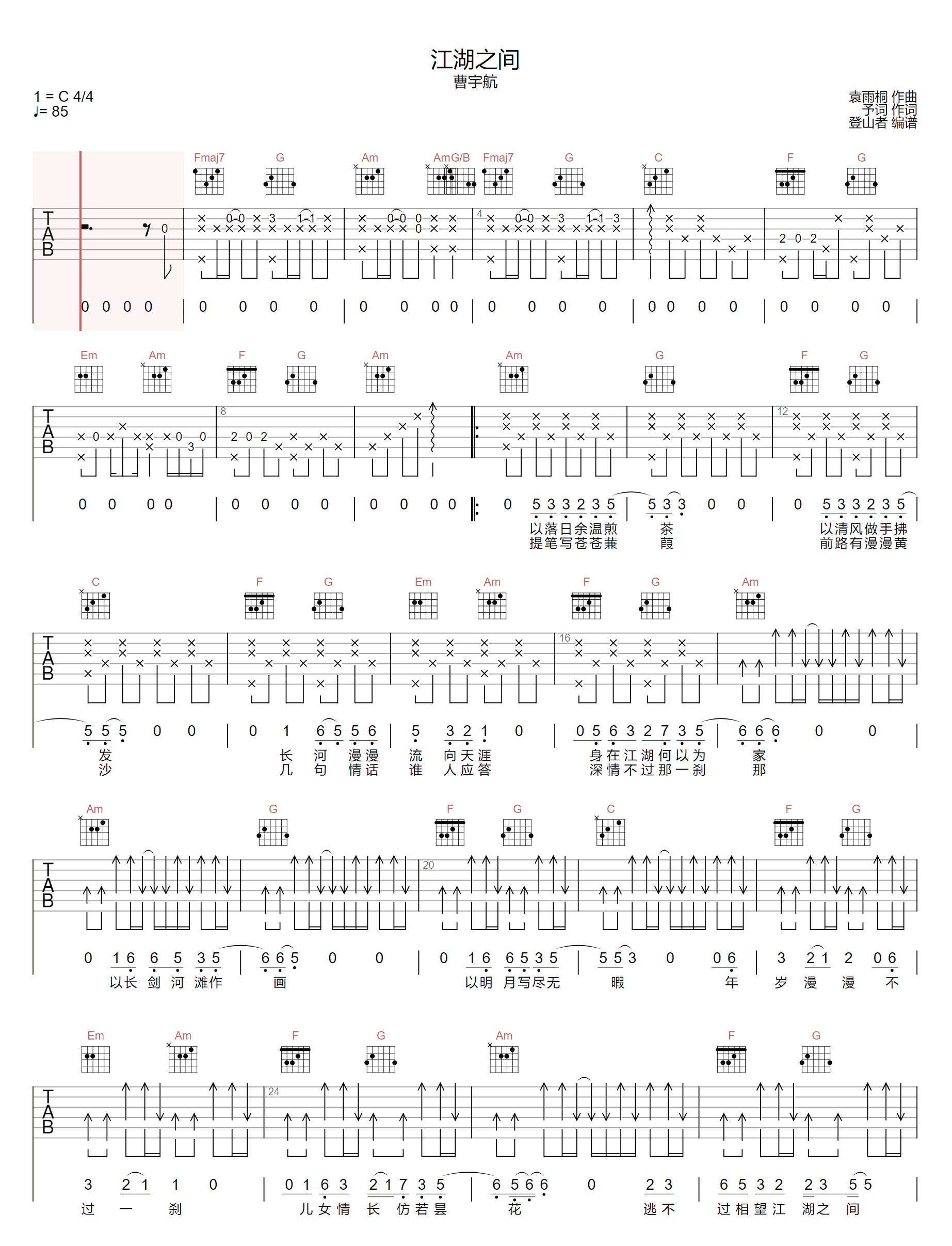 江湖之间吉他谱 - 曹宇航/朝歌夜弦 - C调吉他弹唱谱 - 原版