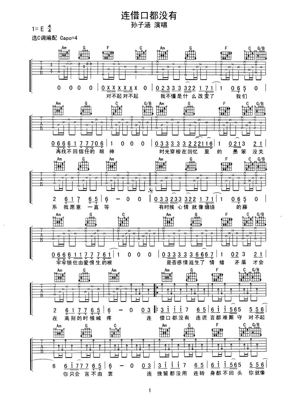 连借口都没有吉他谱 - 孙子涵 - C调吉他弹唱谱 - 原版