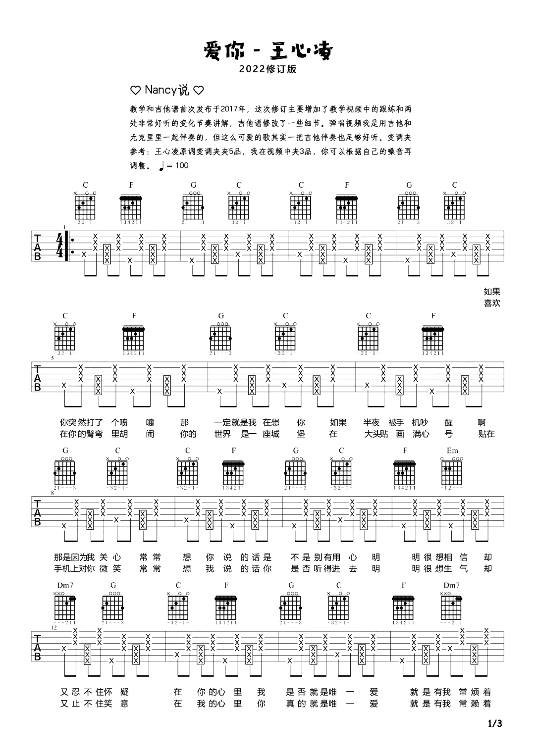 曲谱介绍: 《爱你》吉他弹唱教学 王心凌《爱你》吉他谱分享,一首歌曲可能占据了所有许多男人的心智,在2004年金曲涌现的年代,纯纯的甜味布满全曲,畅快的节奏似乎拨动了所有人的心弦,让人感受到了那种懵懂且没有杂质的“爱”的表白。 《爱你》吉他弹唱谱,2022年修订版,共有3张高清PNG六线谱图例,速度100拍每分钟,节奏4/4拍,全程拍弦节奏弹唱,难度初级较简单,随谱附弹唱演示+教学,稍后会全部更新。