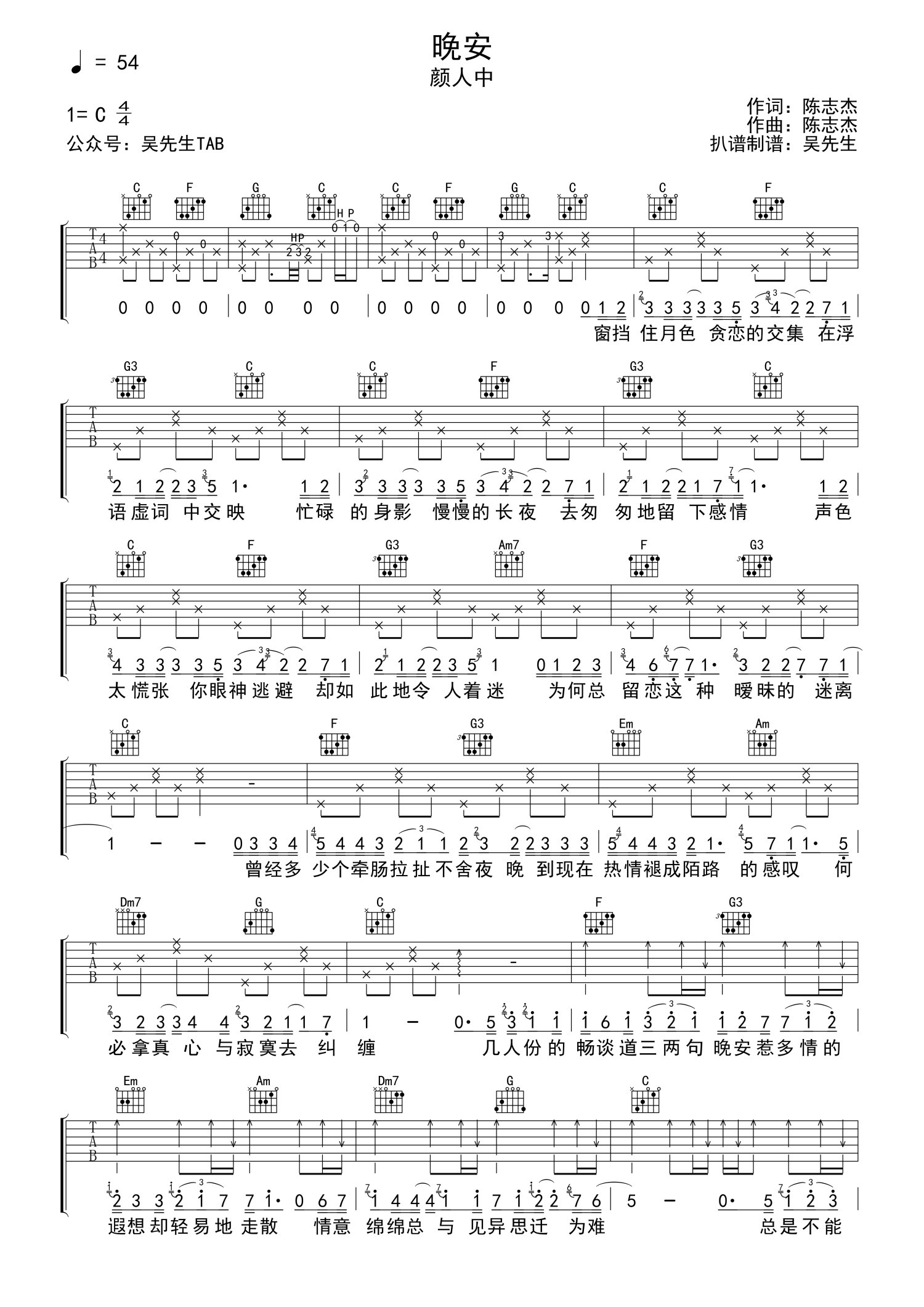 曲谱介绍: 颜人中《晚安》吉他谱_C调吉他弹唱谱