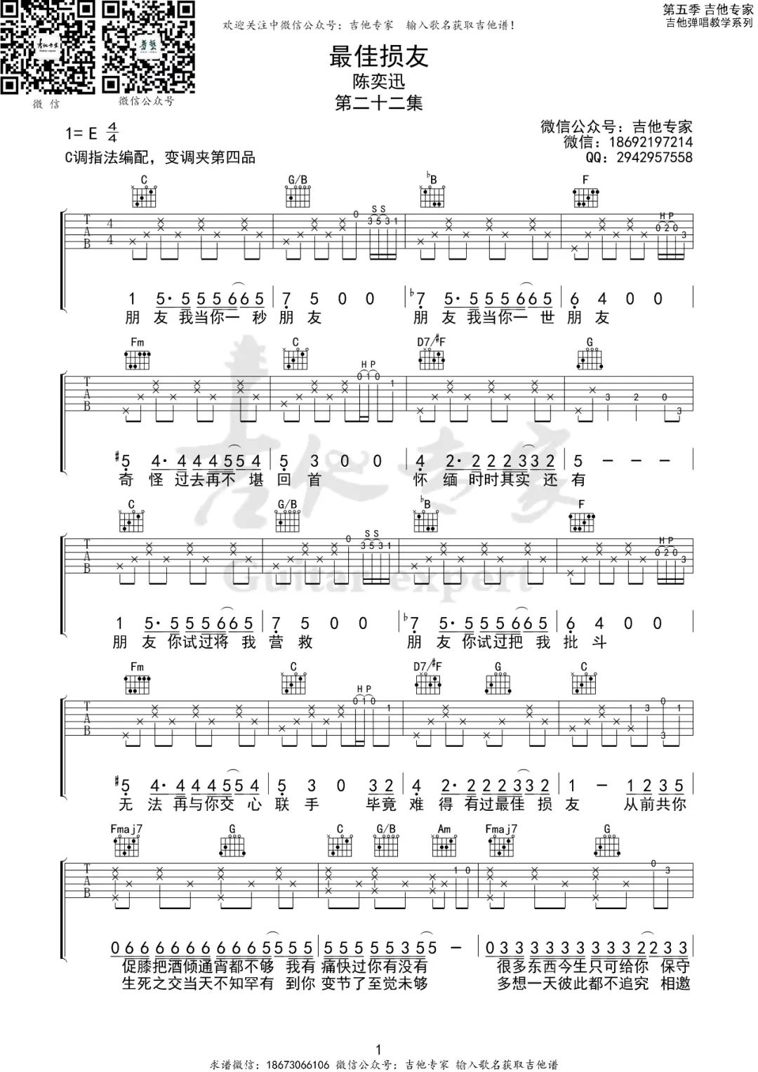曲谱介绍: 吉他谱介绍:最佳损友吉他谱,陈奕迅演唱的一首歌曲,4/4拍的节奏,这首歌曲的原调为E调,这里曲谱采用了C调指法进行编配,演唱时夹变调夹4品可回到原调,也可根据个人实际嗓音情况选择。曲谱由琴谱网更新上传,共3张高清图片弹唱吉他谱例,来源于@吉他专家编配出品。这首歌是讲及与好朋友闹交,之后更会因此而失去某个朋友的那种无奈感觉。