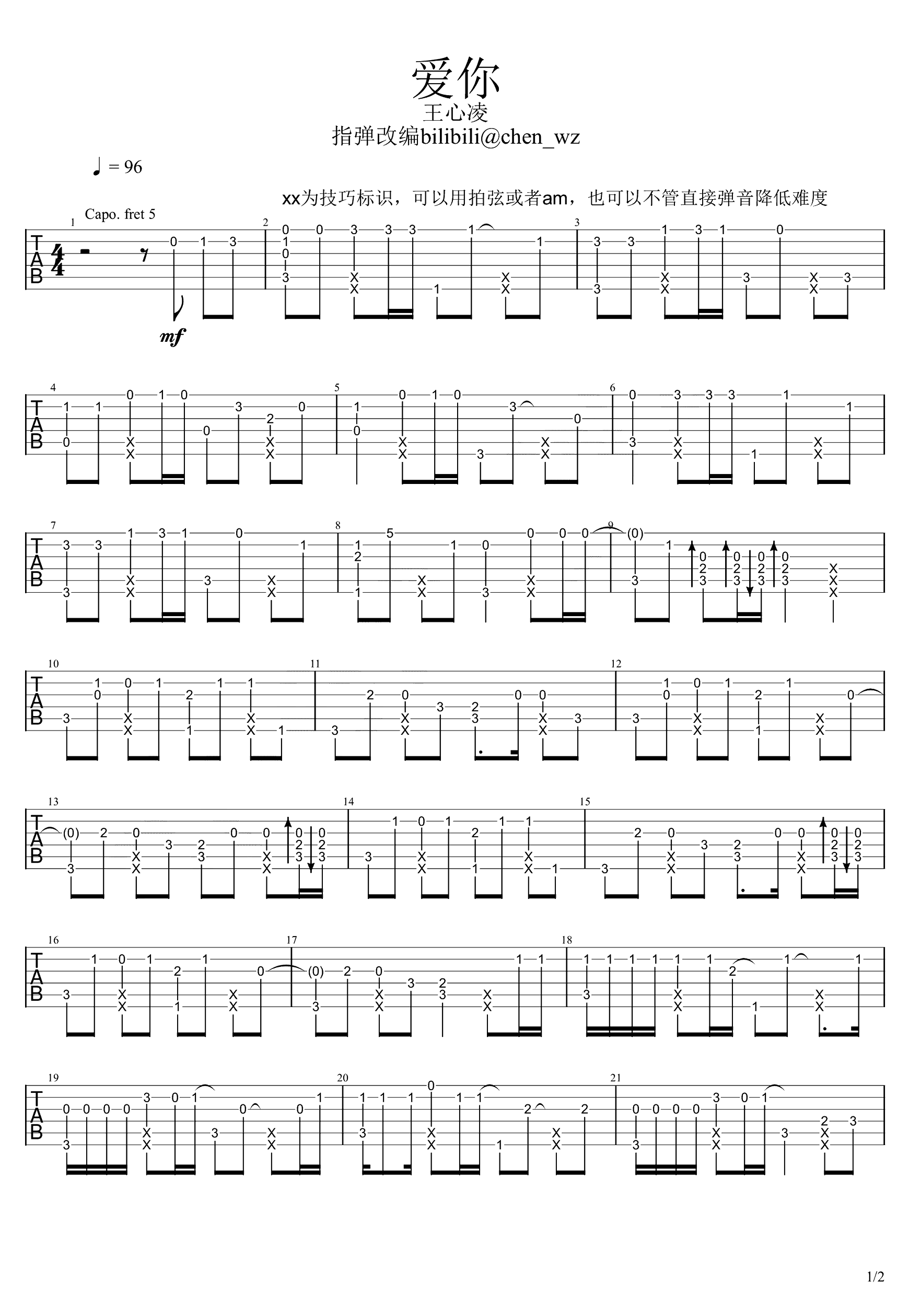 曲谱介绍: 爱你指弹谱,根据2004年王心凌演唱的一首轻快甜味情歌所改编的吉他指弹谱,随谱附指弹独奏演示视频,共有2张PNG高清六线谱图例,选用C调指法,速度96拍每分钟,变调夹可夹5品弹奏原调。 相信多年以来大家不断的跟着娱乐风向标所流动,但对于很多人而言,王心凌至少巅峰时期是男女都喜欢的纯真代表,《爱你》轻快而耐听,甜美的味道只会让人幸福满满且开心,如此,也便足够了!唱唱跳跳,那是人生的重量,在地板上倔强地碰撞。 指弹谱详情