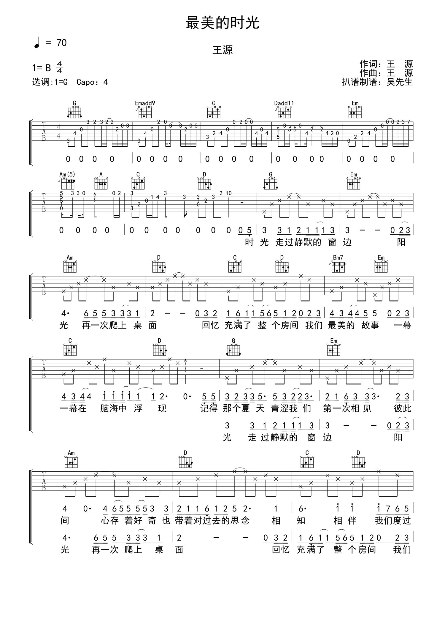 • 最美的时光吉他谱 - 王源 - G调吉他弹唱谱第1张