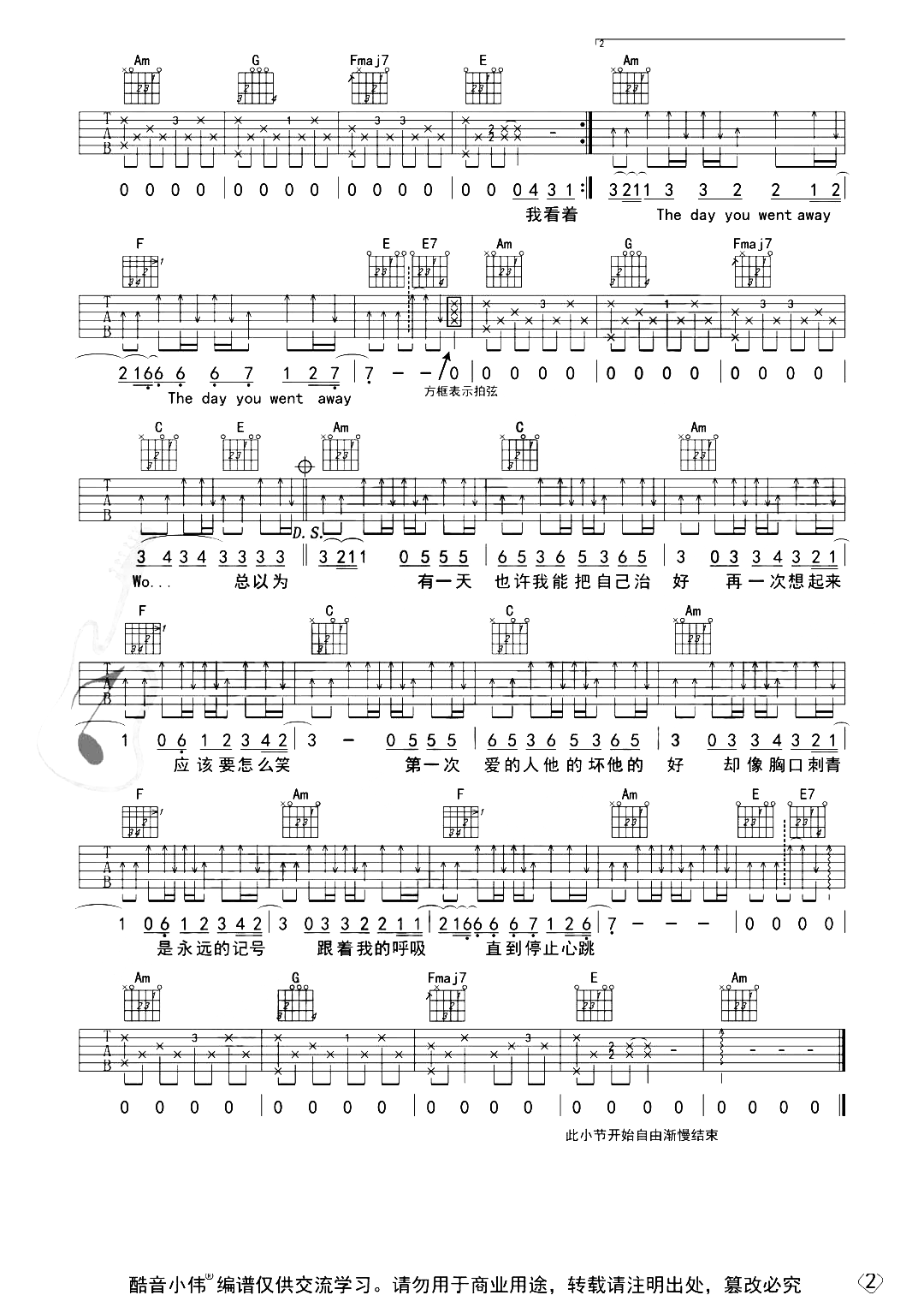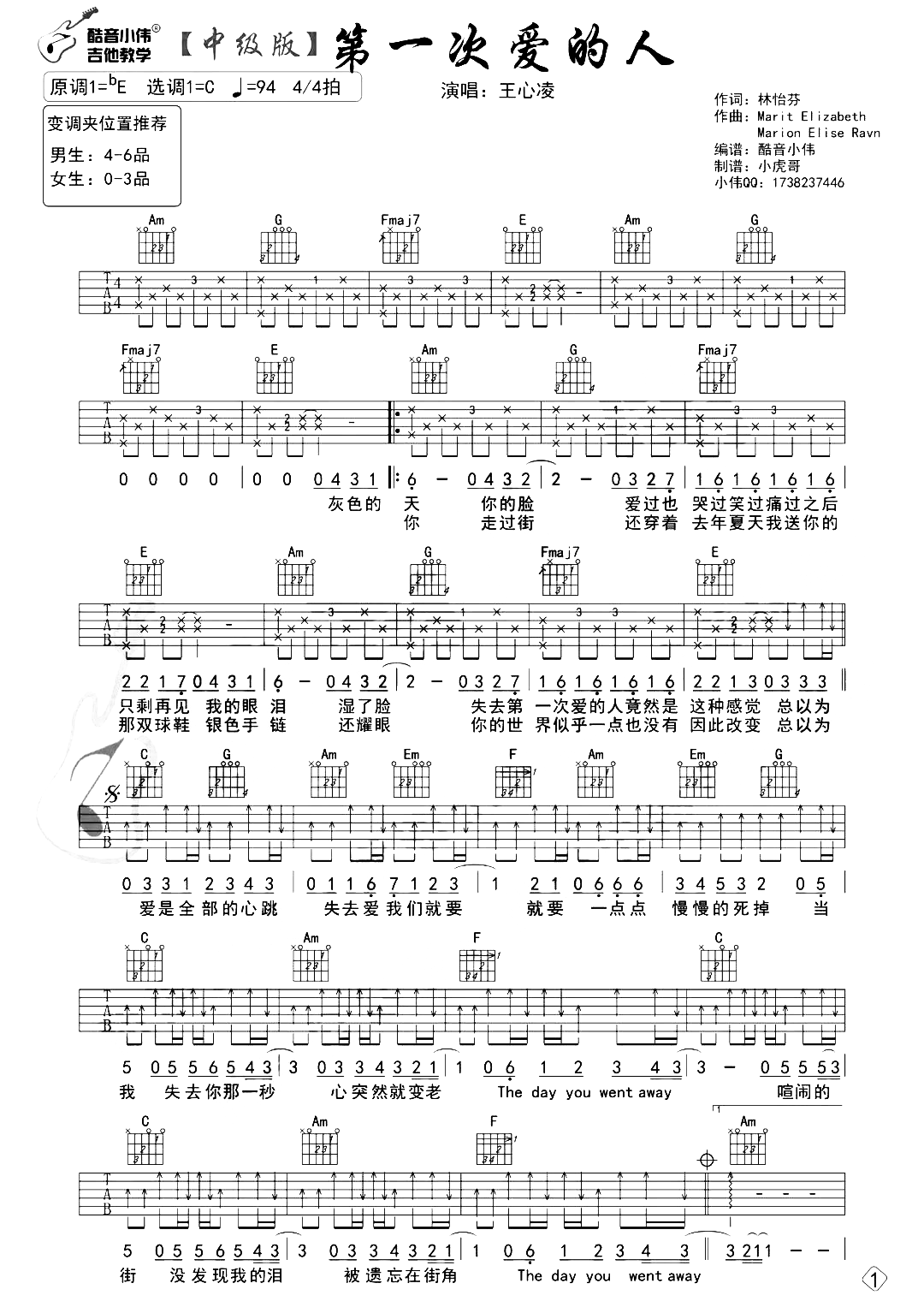 曲谱介绍: 第一次爱的人吉他谱,歌曲的作曲源自m2m歌曲《the day you went away》,第一次的“初恋”在每个人心中都会有独特的位置,铭刻于心且难以代替,里面的一词一句都透露着初恋的青涩、无奈、伤感之情,每当听到此曲共鸣和回忆感被拉满。 《第一次爱的人》吉他弹唱谱,中级版编配,还原度较高,随谱附弹唱演示+教学视频,本谱是选用C调,原调bE,男生CAPO推荐4-6品,女生0-3品,速度94BPM,节奏4/4拍,共2张高清PNG图片谱例。