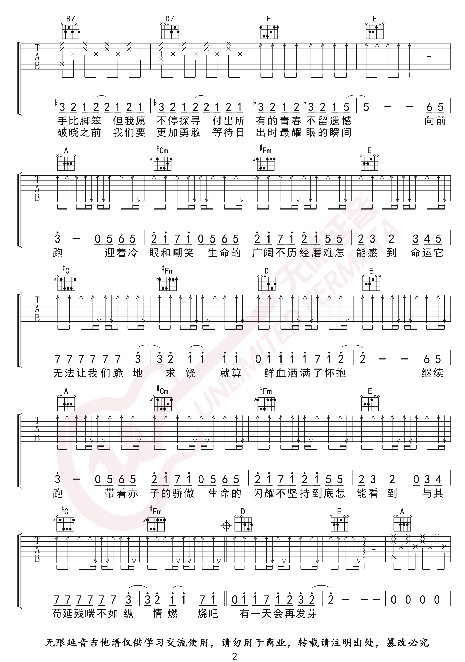 曲谱介绍: 吉他谱介绍:追梦赤子心吉他谱,GALA乐队演唱的一首歌曲,4/4拍的节奏,这首歌曲的原调为A调,这里曲谱采用了A调指法进行编配,演唱时可不夹变调夹,曲谱由琴谱网更新上传,共3张高清图片弹唱吉他谱例,来源于@无限延音编配出品。这首歌是由GALA乐队演唱的一首经典励志歌曲,GALA乐队希望用这首歌来告诉大家:就算遇到挫折、受到嘲笑,也要勇敢的向前跑,永不停止。