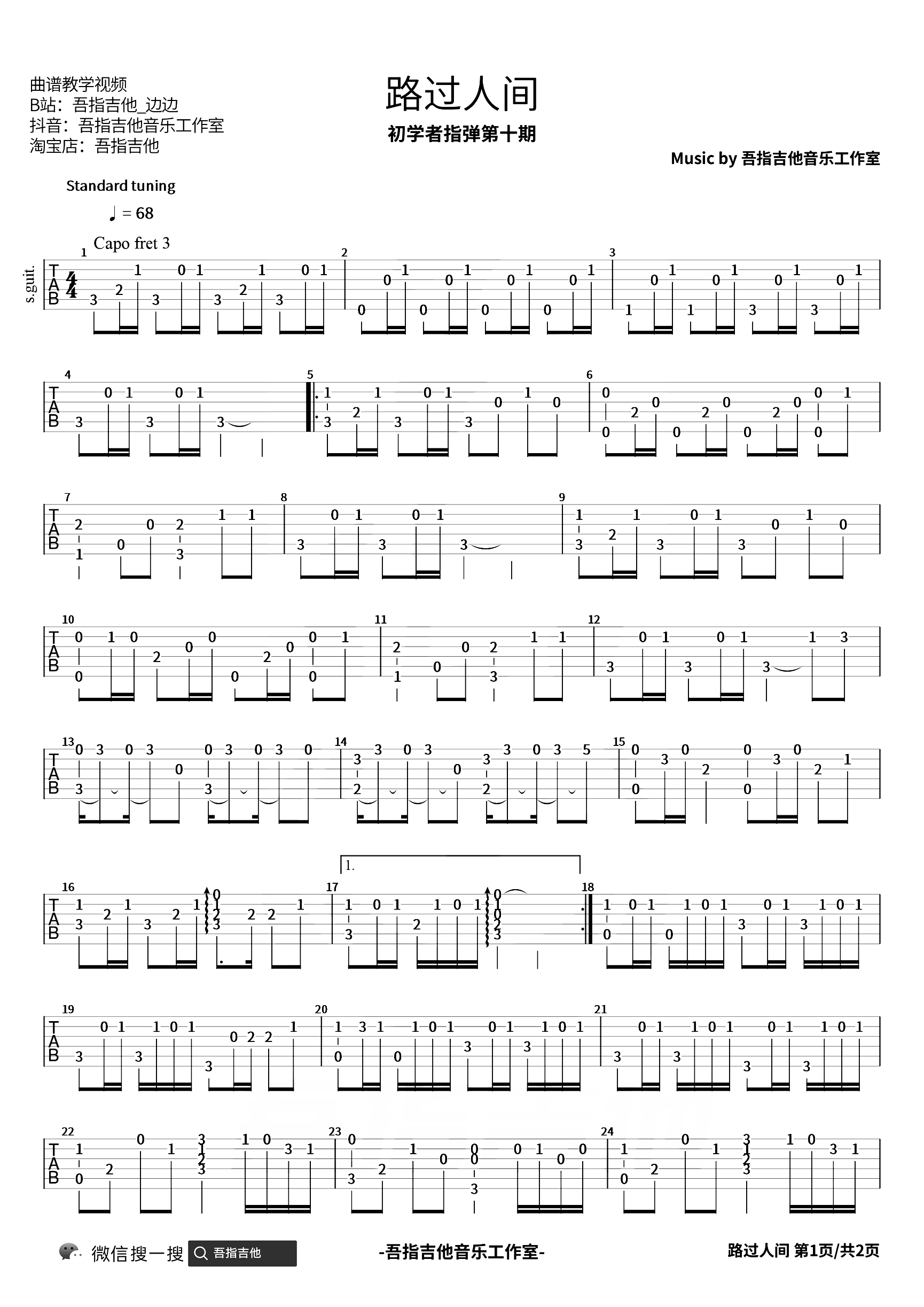 曲谱介绍: 路过人间指弹吉他谱,是根据郁可唯演唱的歌曲改编的指弹曲目,CAPO夹3品,速度68拍每分钟,共有2张高清PNG图片谱例,《路过人间》指弹演示/教学视频,由吾指吉他录制,亲友们可跟着老师参照练习。 重复的弦乐节奏,舒缓中给人无暇的优美感,轻轻的如微风拂过,路过人间,那是用音乐传递着人生阅历的思考,不断的改变与成长,会让我们欣然感慨。 指弹谱详情