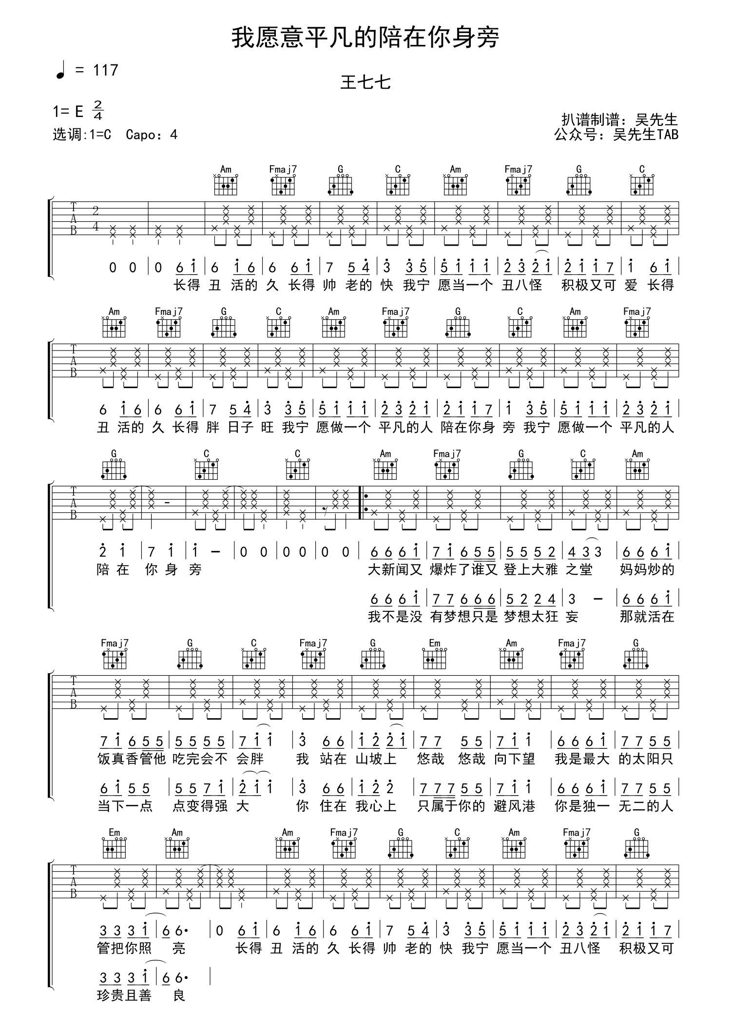 • 我愿意平凡的陪在你身旁吉他谱 - 王七七 - C调吉他弹唱谱第1张