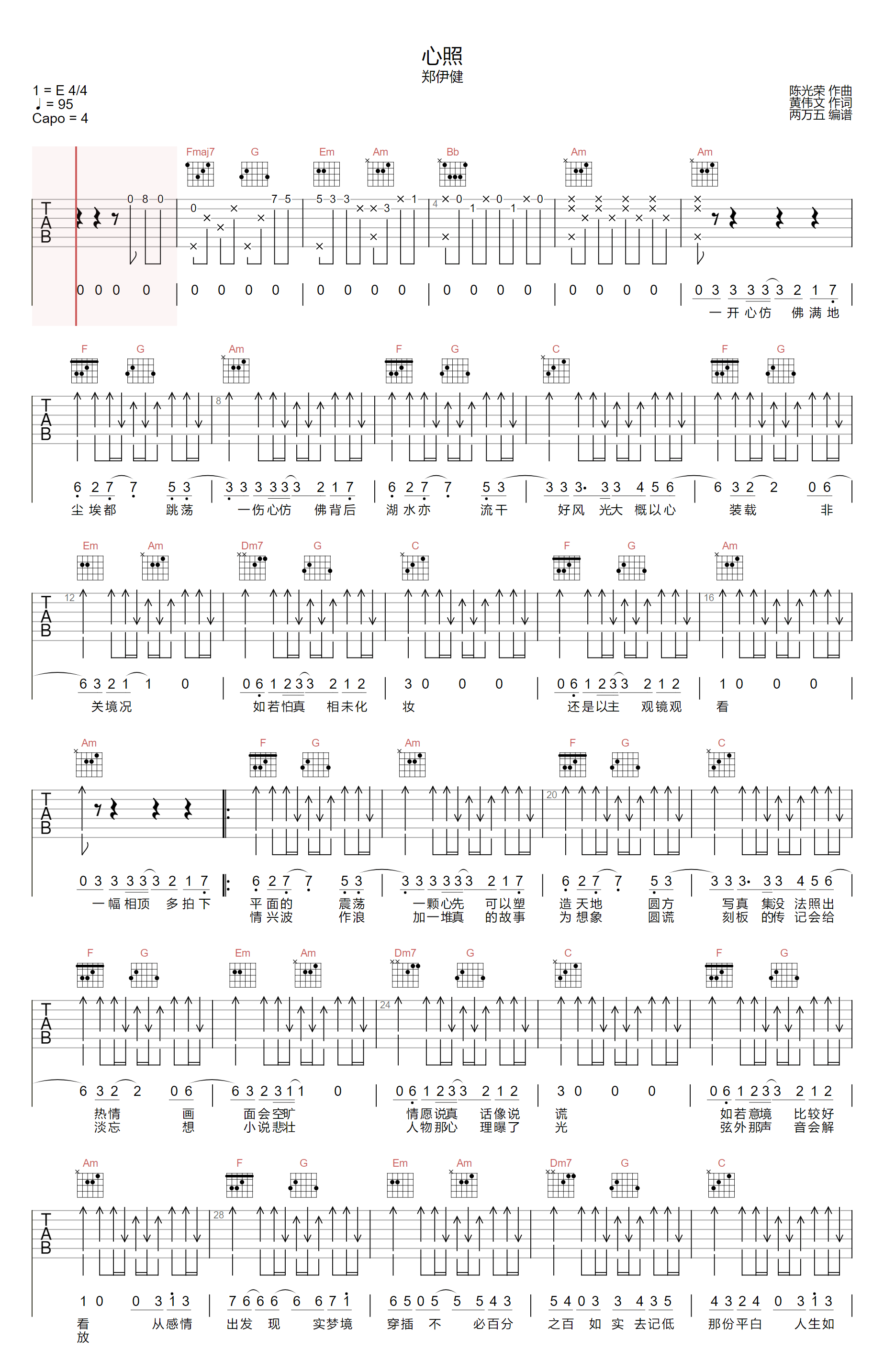 曲谱介绍: 吉他谱介绍:心照吉他谱,郑伊健演唱的一首歌曲,4/4拍的节奏,这首歌曲的原调为E调,这里曲谱采用了C调指法进行编配,演唱时夹变调夹4品可回到原调,也可根据个人实际嗓音情况选择。曲谱由琴谱网更新上传,共3张高清图片弹唱吉他谱例,来源于@两万五编配出品。人生如画册,我有我的浪漫手法,剪贴着记忆,将最完美的定格。这首歌是郑伊健演唱的一首歌曲,这首歌的旋律轻快,听着让人觉得很愉快,总会不由自主地跟着哼唱起来。