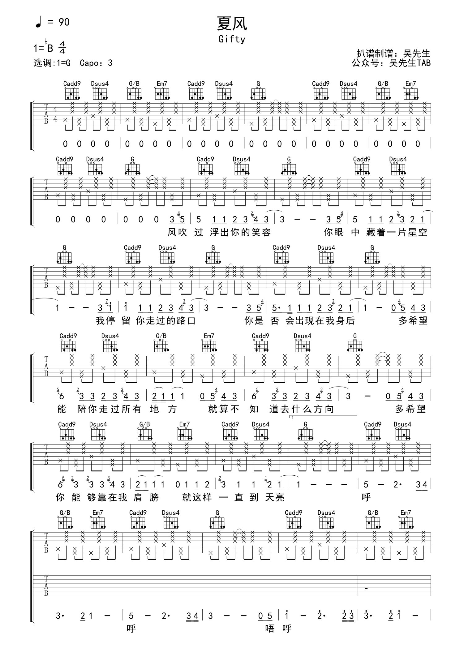 曲谱介绍: 《夏风》吉他谱,GIFTY演唱,原调bB,选调G,Capo夹三品。