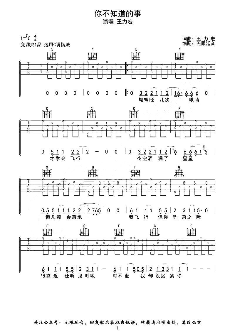 曲谱介绍:   你不知道的事吉他谱,王力宏演唱,《你不知道的事》吉他弹唱谱,选用C调指法,原调#C,变调夹夹1品弹唱原调,含简单前奏较接近原版,共3张高清PNG图片谱,随谱附弹唱示范,可参照练习。