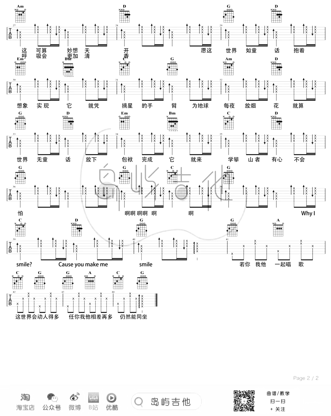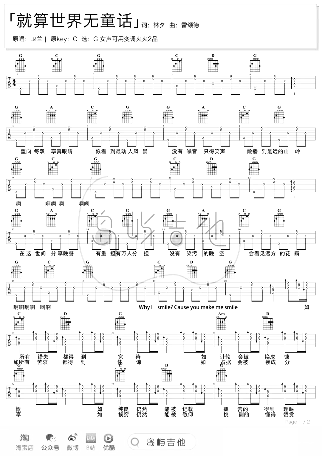 曲谱介绍: 《就算世界无童话》吉他弹唱教学 就算世界无童话吉他谱,卫兰演唱的粤语歌曲,旋律纯粹而清新,卫兰透亮的嗓音,仿佛演绎着无限的美好 《就算世界无童话》吉他弹唱谱,选用G调指法,原调C调,女生弹唱可夹2品,随谱附弹唱演示+教学视频,可供大家参照,本谱难度初级简单,共有2张高清PNG图片谱。