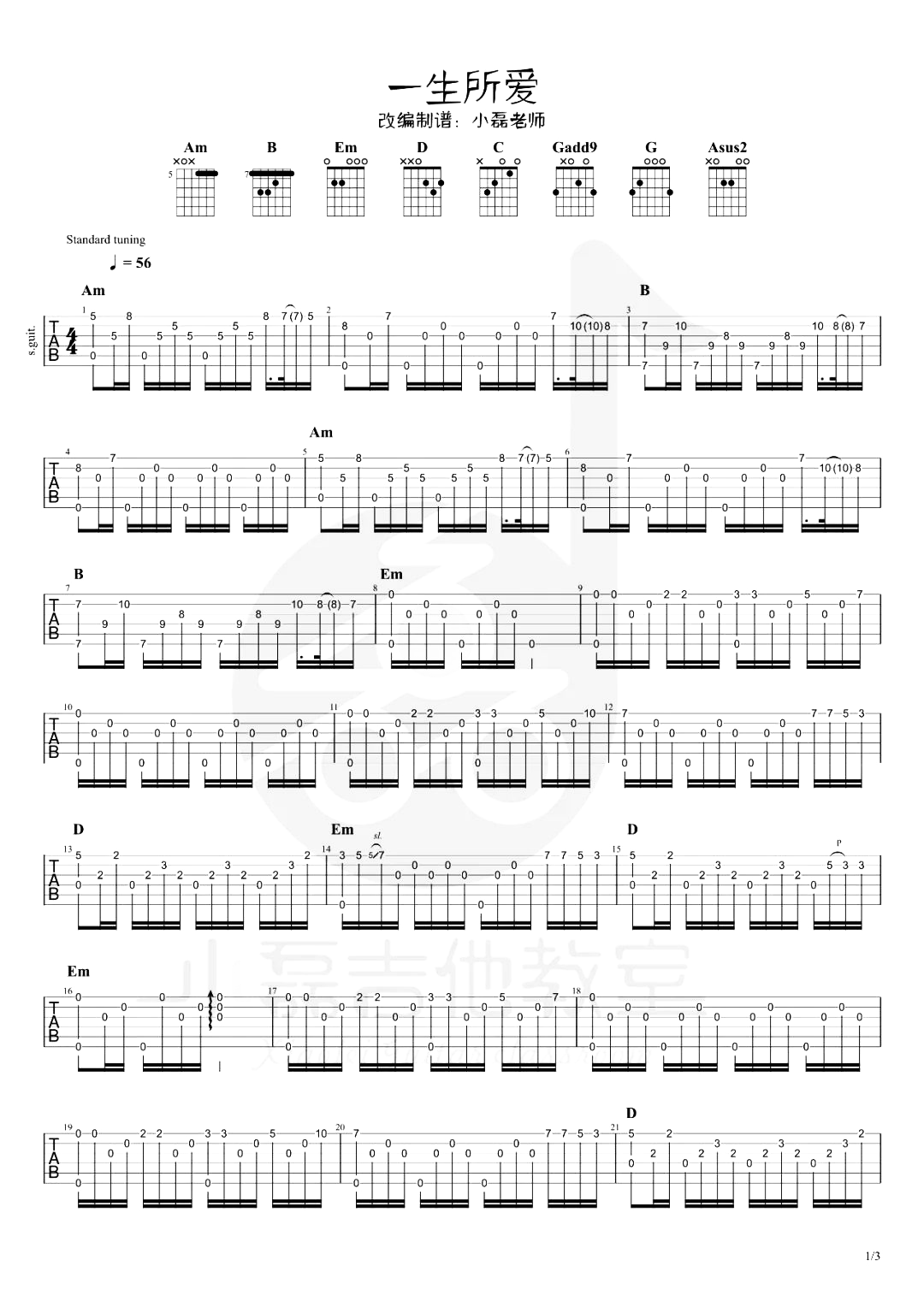 曲谱介绍: 一生所爱指弹谱,根据电影《大话西游》改变的吉他独奏曲谱,本谱共3张高清PNG图片谱,速度56BPM,节奏4/4拍,随谱服《一生所爱》的吉他指弹演示+教学视频,弹奏难度适中。 此生与来世,愿心系一人,因为这也许是最幸福的事情,这首歌通过舒缓柔情的旋律,深深的浸入心扉,传递着那种坚毅且深刻爱着一个人的状态。 指弹谱详情