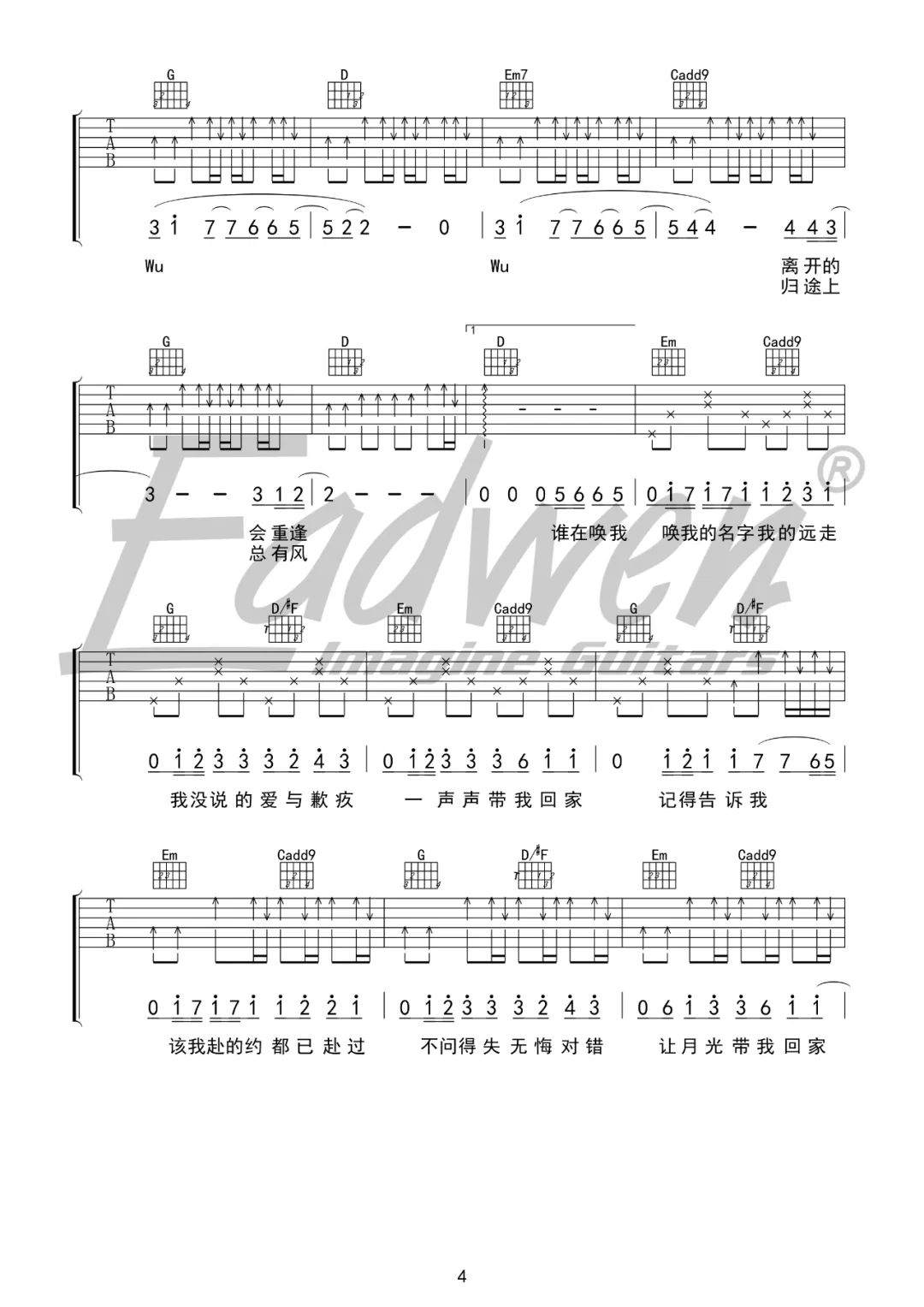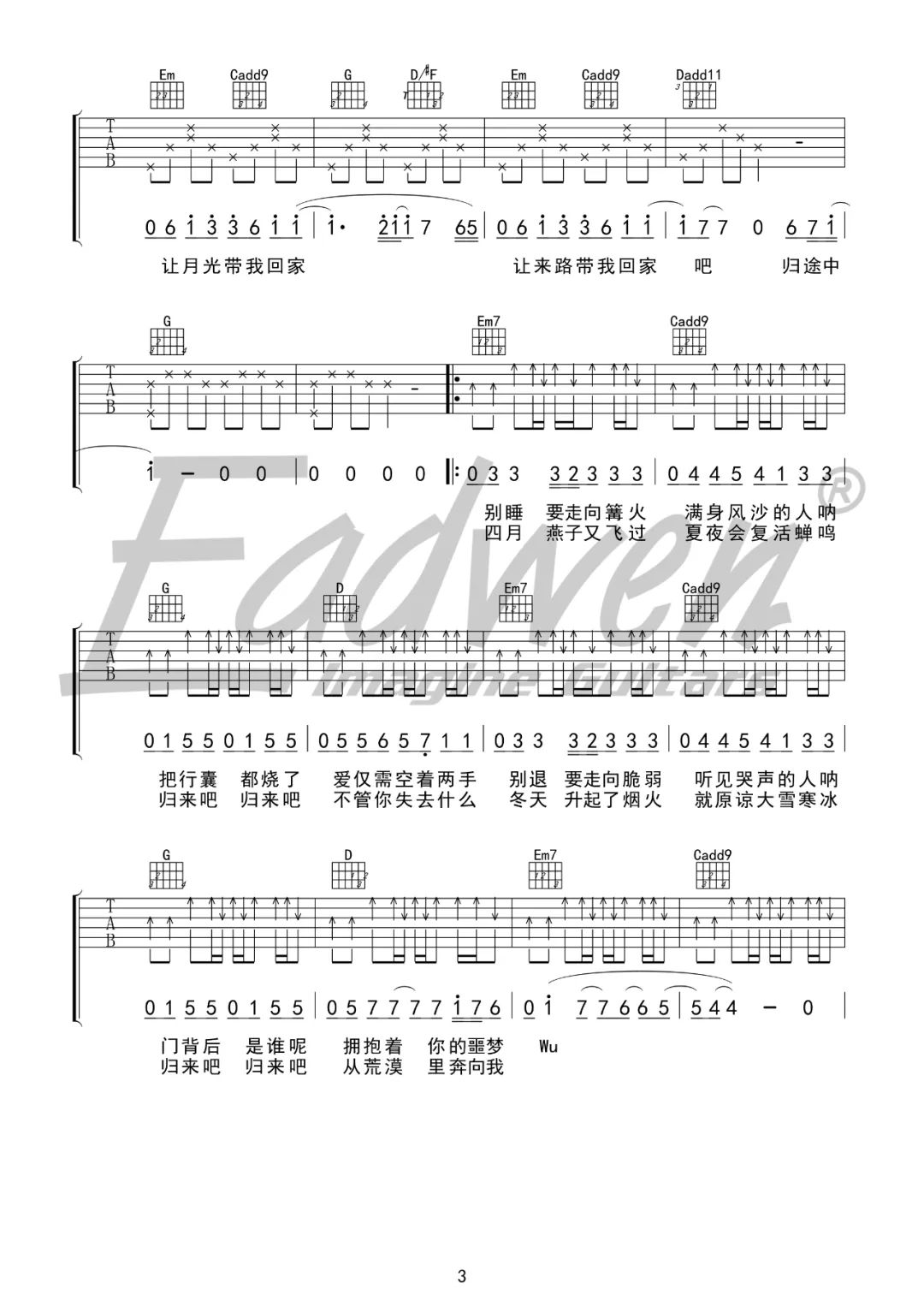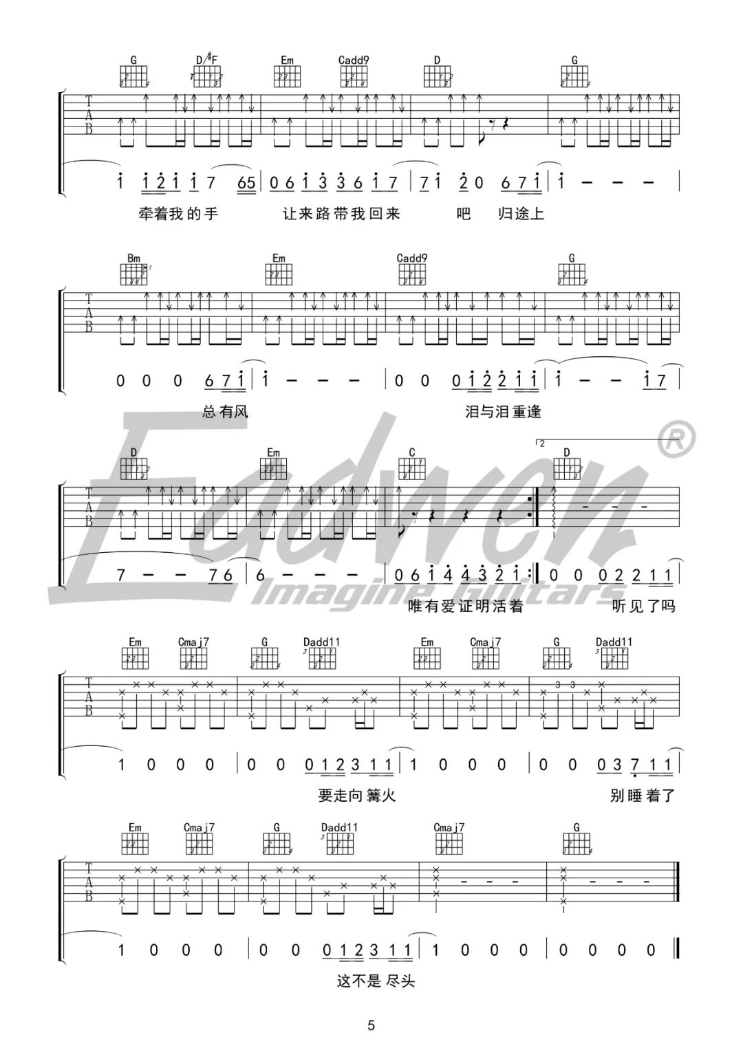 曲谱介绍: 吉他谱介绍:归途有风吉他谱,王菲演唱的一首歌曲,4/4拍的节奏,这首歌曲的原调为降A调,这里曲谱采用了G调指法进行编配,演唱时夹变调夹1品可回到原调,也可根据个人实际嗓音情况选择。曲谱由琴谱网更新上传,共5张高清图片弹唱吉他谱例,来源于@爱德文吉他教室编配出品。