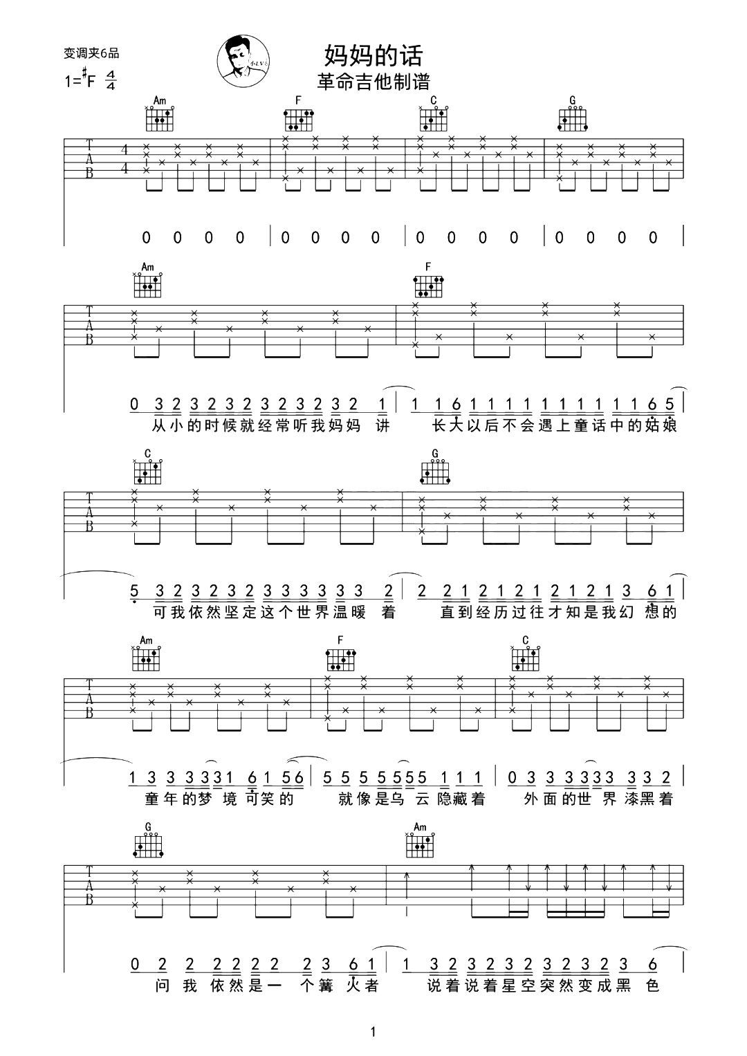 曲谱介绍: 妈妈的话吉他谱,zyboy忠宇演唱,开篇满满的故事感带入,歌曲更像是RAP+流行音乐的巧妙融合。 《妈妈的话》吉他弹唱谱,选用C调,原调#F,随谱附弹唱演示+教学视频,变调夹夹6品弹唱原调,半分解和弦为右手主要节奏,弹唱难度初级简单,共4张高清PNG图片谱例,由革命吉他制谱分享。