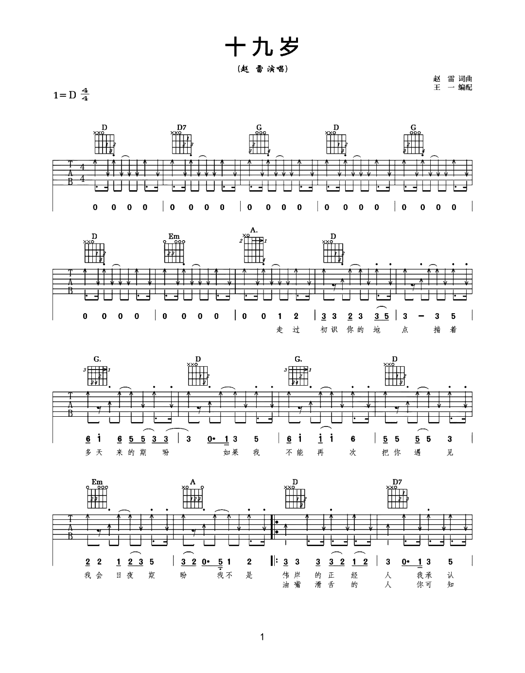 曲谱介绍: 十九岁吉他谱,赵雷一首更热情饱满的民谣歌曲。 《十九岁》吉他六线谱,原版编配,随谱附弹唱教学视频,本谱选用D调指法,全曲右手以扫弦节奏贯穿,难点就在于附点及切音、延音的过度技巧,具体请参照老师视频结合练习,共4张高清PNG图片谱。