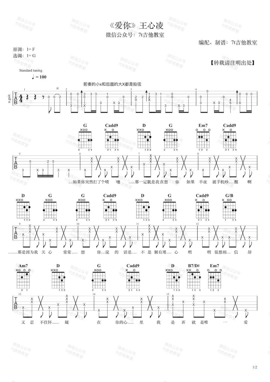 曲谱介绍: 《爱你》曲谱:     爱你吉他谱,王心凌近期翻红的老歌,《爱你》吉他弹唱谱,选用G调指法编配,速度100BPM,节奏4/4拍,原调F调,本谱含完整前奏,拍弦为本版节奏型,难度适中,男生可不用变调夹弹唱,可参照随谱的弹唱演示视频,跟随7T老师练习。