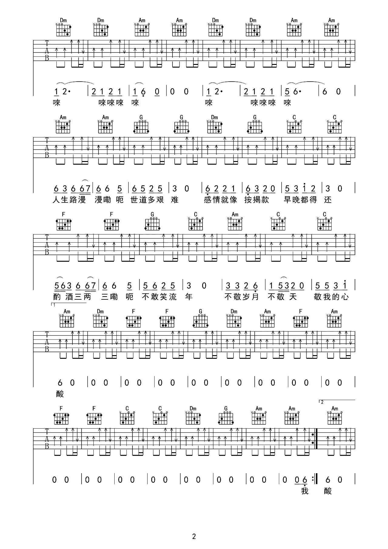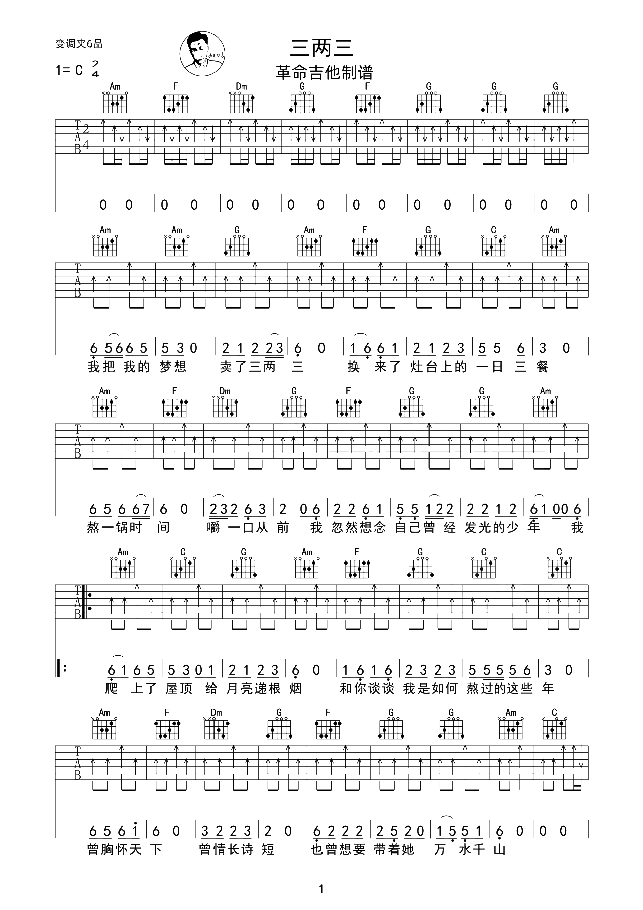 曲谱介绍: 《三两三》吉他谱的其他链接版本:     三两三吉他谱,凌丰演唱的网络歌曲,《三两三》吉他弹唱谱,选用C调指法,原调#F,CAPO夹6品可弹回原调,全曲扫弦贯穿,2/4节拍,共3张高清PNG图片谱,具体可参考随谱的弹唱演示/教学视频。 畅快的曲风,直白通俗的歌词,烟嗓的演唱方式拉满共鸣,酌酒三两三,唱出无数人的不易与心酸。