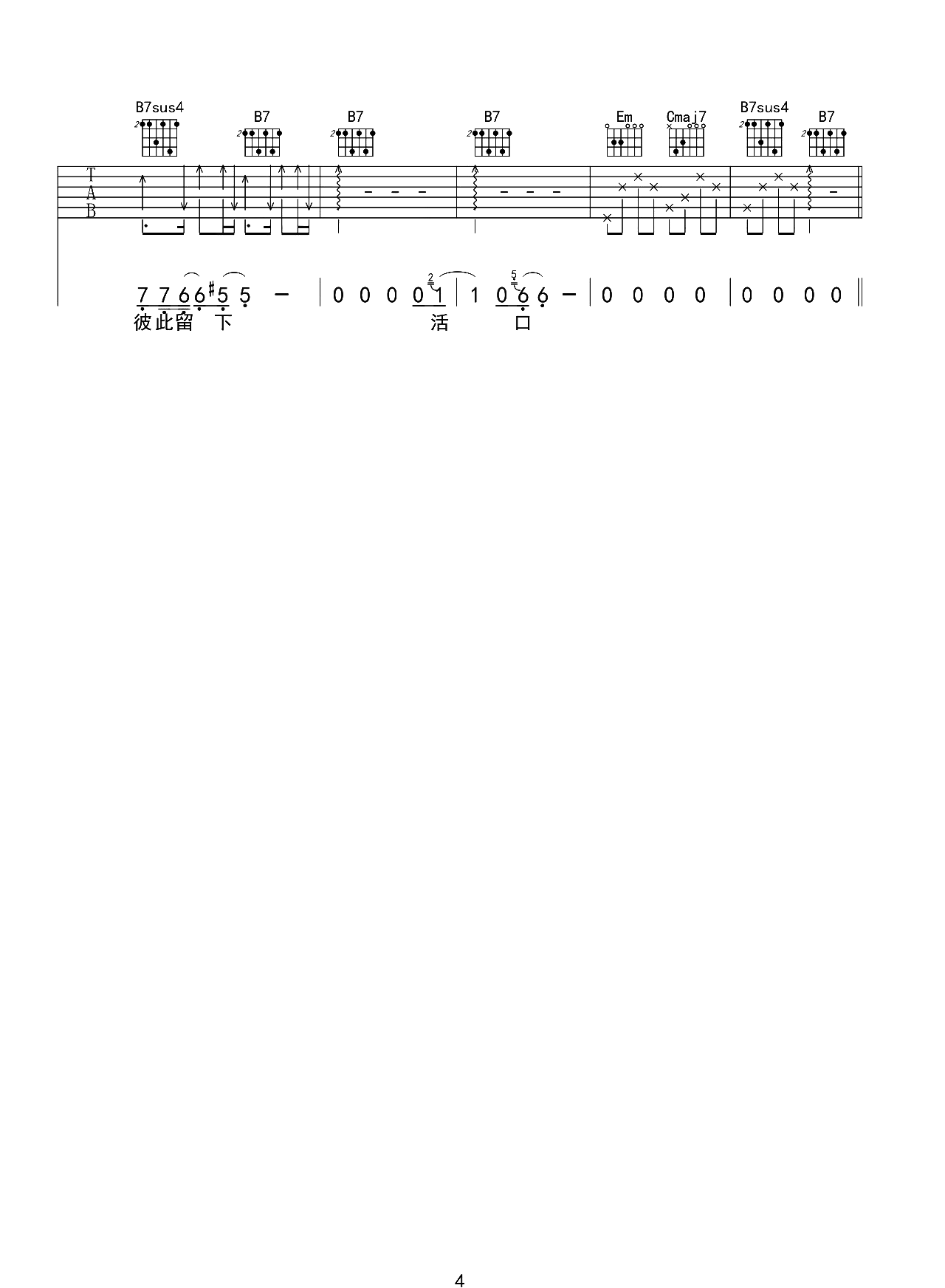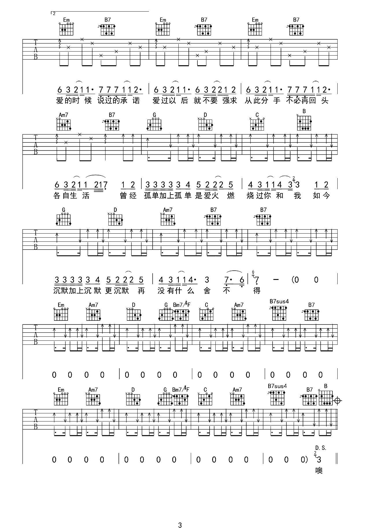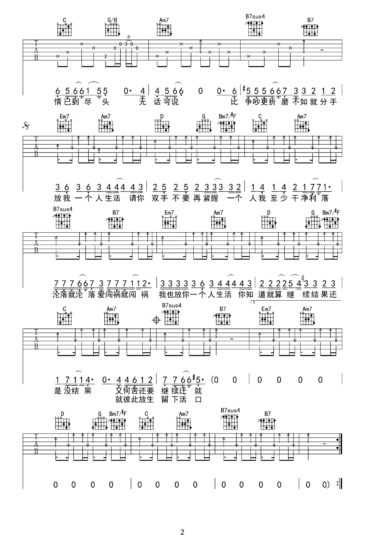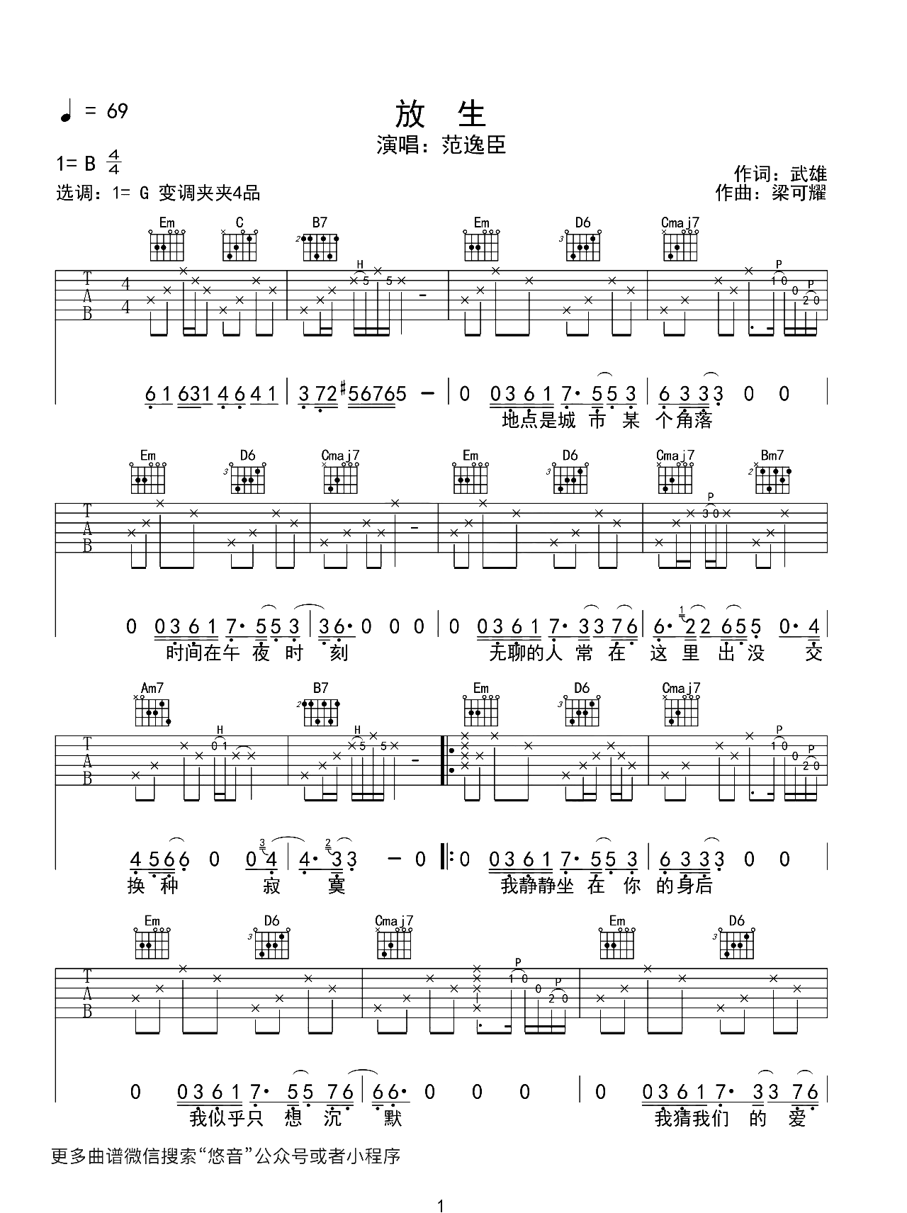 曲谱介绍: 放生吉他谱,范逸臣演唱的伤感情歌,《放生》吉他弹唱谱,选用G调指法编配,原调B调,弹回原调推荐CAPO夹4品,速度69BPM,节奏4/4拍,本谱90%接近原版(solo间奏改为扫弦),难度适中,随谱附《放生》吉他弹唱演示视频,供大家参考。