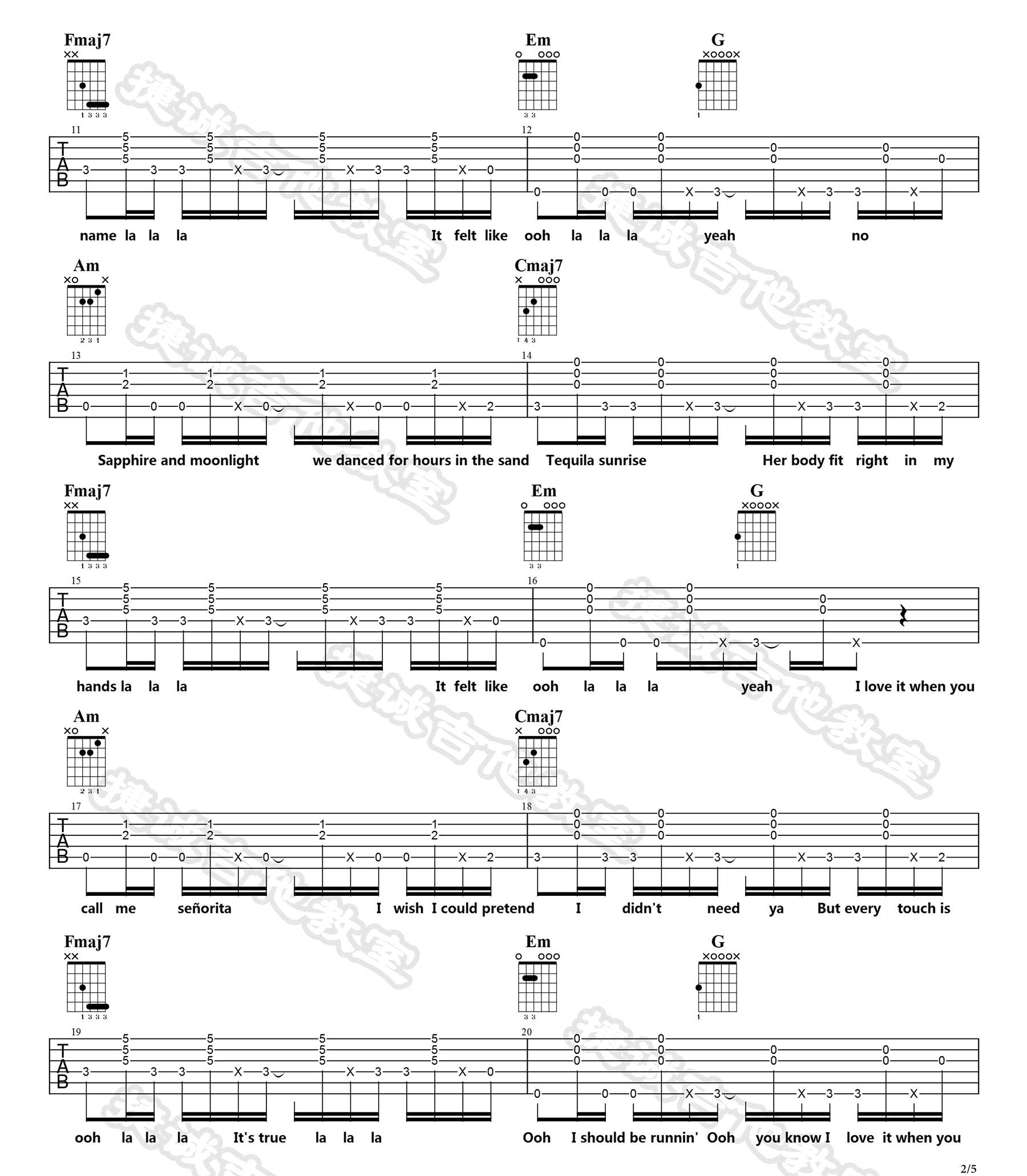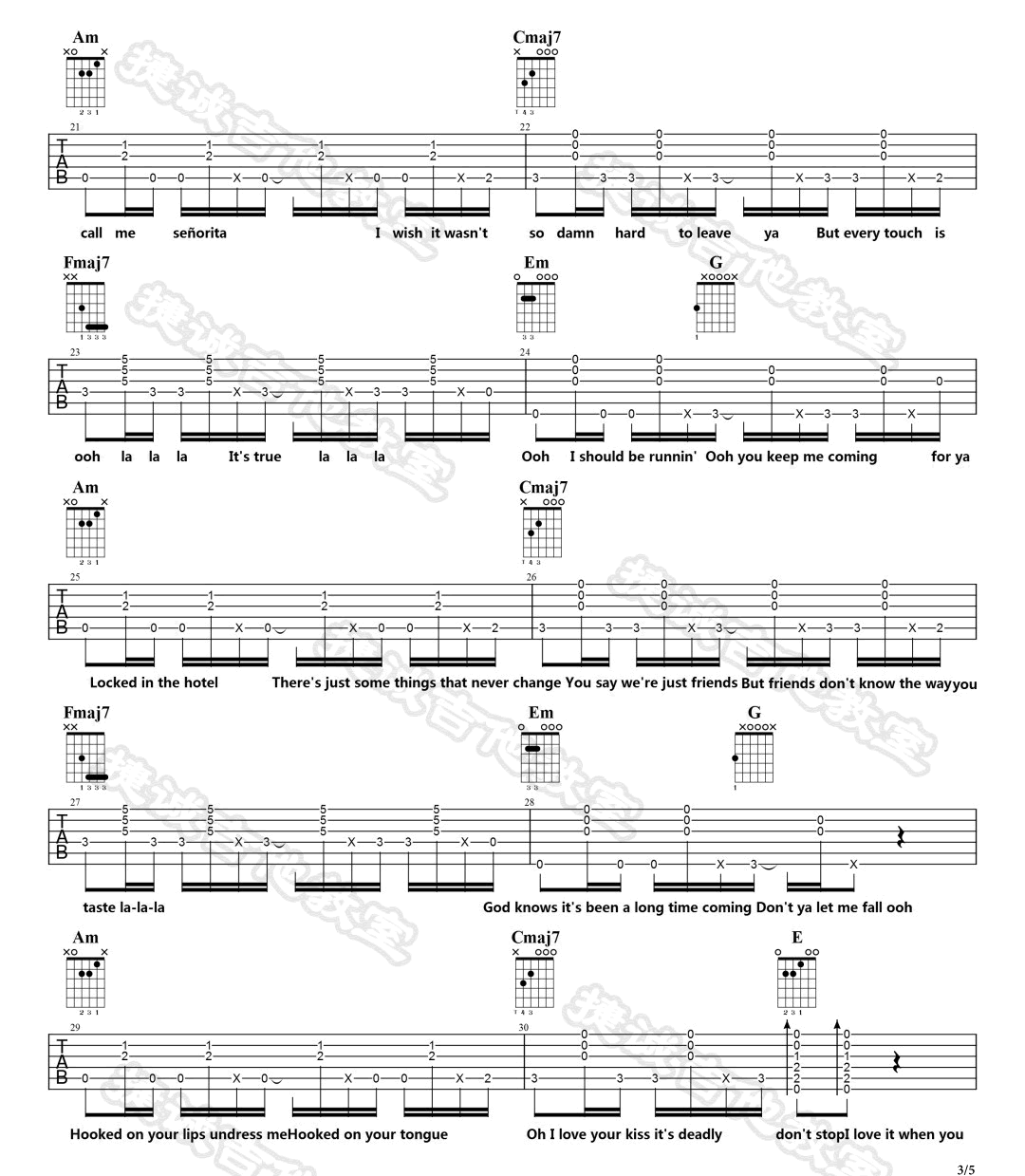 曲谱介绍: 吉他谱介绍:Senorita吉他谱,Shawn-Mendes演唱的一首歌曲,4/4拍的节奏,这首歌曲的原调为C调,这里曲谱采用了C调指法进行编配,演唱时可不夹变调夹,曲谱由琴谱网更新上传,共5张高清图片弹唱吉他谱例,来源于@捷诚吉他教室编配出品。加拿大女歌手ShawnMendes和美国女歌手CamilaCabello联合演唱的一首歌曲,一首非常好听的男女对唱情歌作品。
