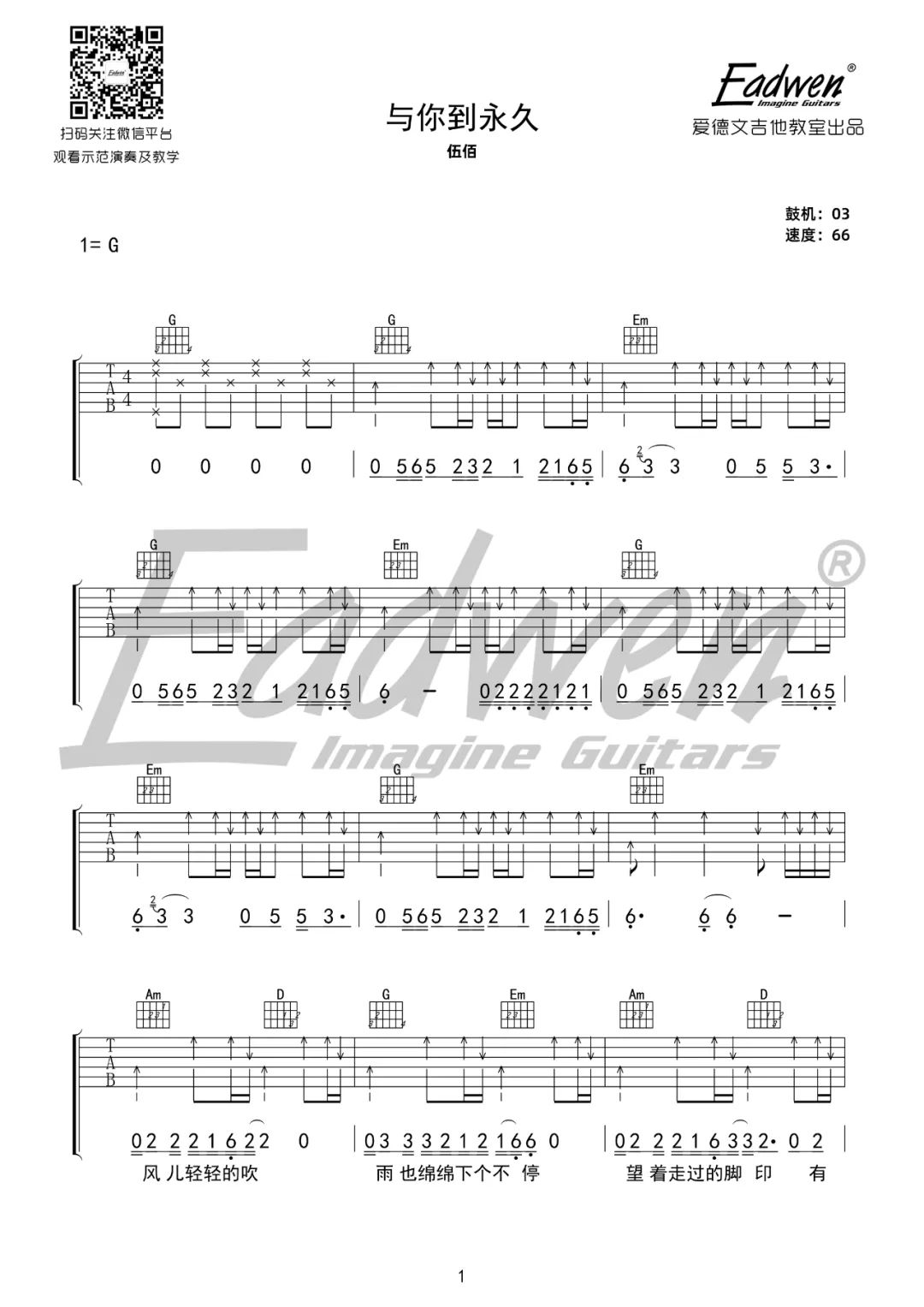 曲谱介绍: 吉他谱介绍:与你到永久吉他谱,伍佰演唱的一首歌曲,4/4拍的节奏,这首歌曲的原调为G调,这里曲谱采用了G调指法进行编配,演唱时可不夹变调夹,曲谱由琴谱网更新上传,共6张高清图片弹唱吉他谱例,来源于@爱德文吉他教室编配出品。