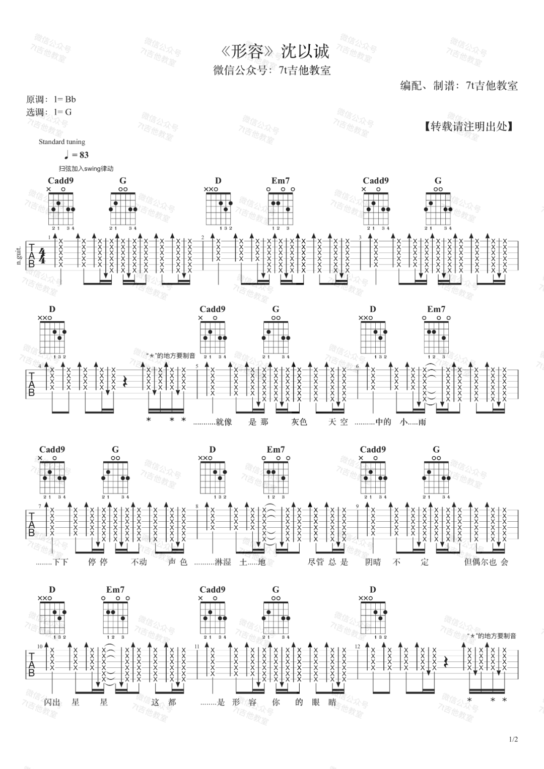 曲谱介绍: 吉他谱介绍:形容吉他谱,沈以诚演唱的一首歌曲,4/4拍的节奏,这首歌曲的原调为降B调,这里曲谱采用了G调指法进行编配,演唱时夹变调夹3品可回到原调,也可根据个人实际嗓音情况选择。曲谱由琴谱网更新上传,共2张高清图片弹唱吉他谱例,来源于@7T吉他教室编配出品。