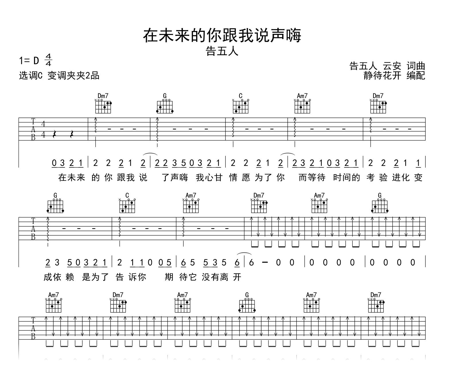 曲谱介绍: 在未来的你跟我说声嗨吉他谱,告五人的一首热门新歌,《在未来的你跟我说声嗨》吉他弹唱六线谱,编配制作采用C调和弦指法,原调D调,推荐变调夹夹2品,大家也可以根据自己音高实际情况选择变调夹,速度大概每分钟100拍,整体难度简单。
