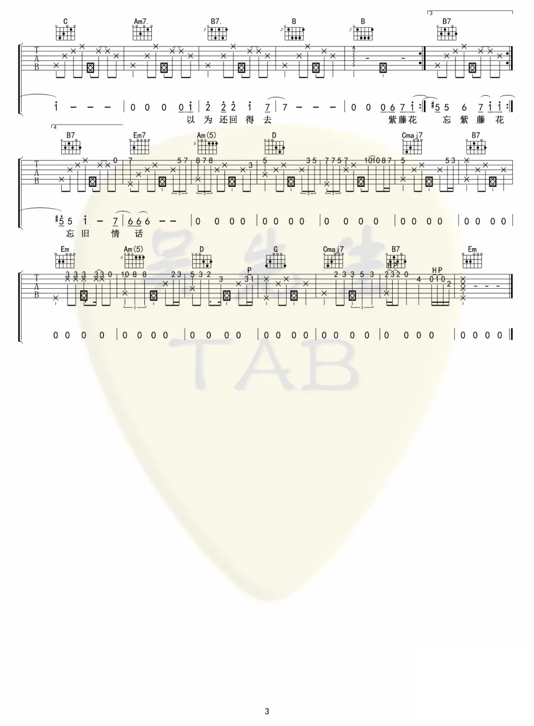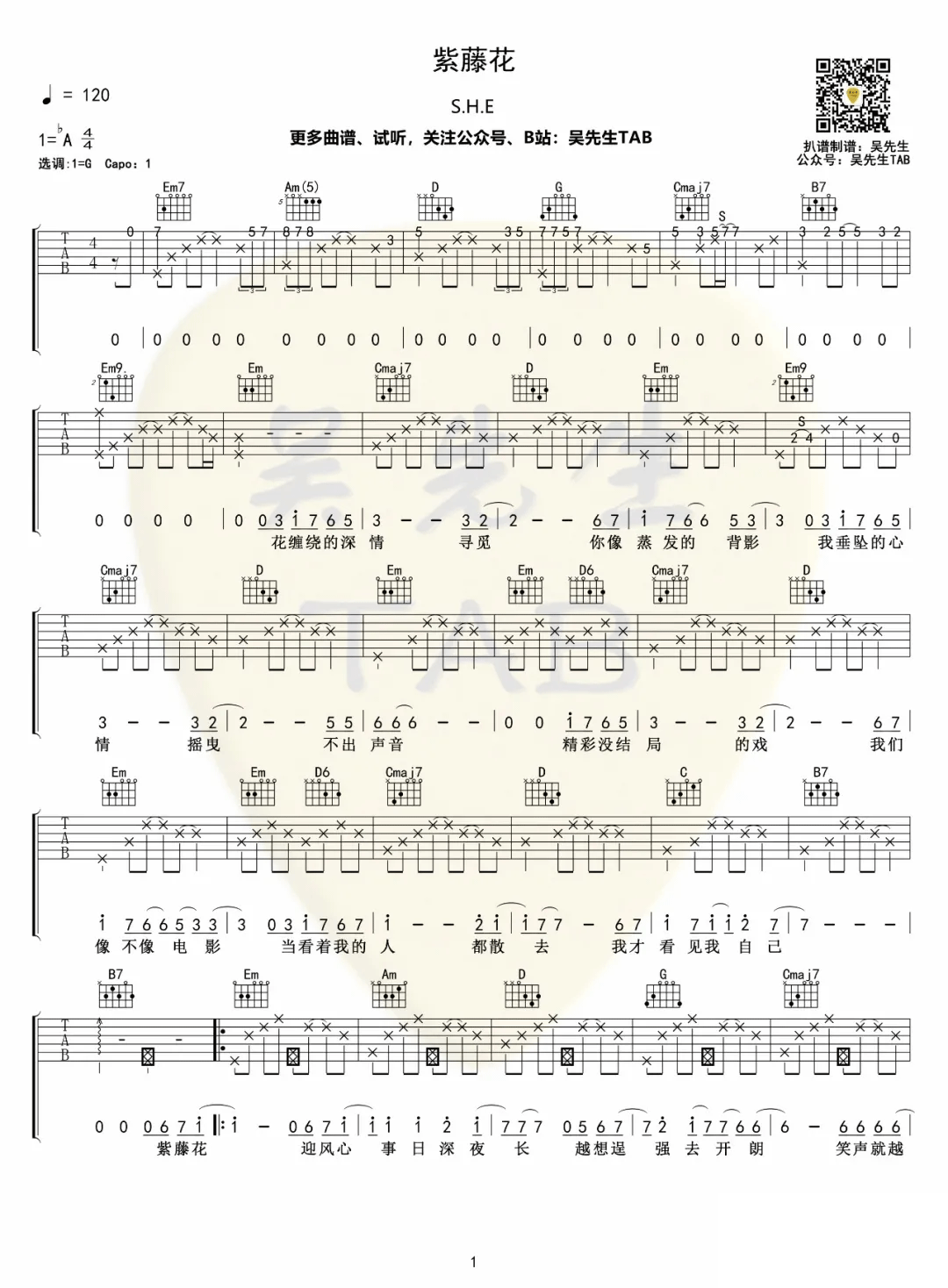 曲谱介绍: 吉他谱介绍:紫藤花吉他谱,S.H.E演唱的一首歌曲,4/4拍的节奏,这首歌曲的原调为降A调,这里曲谱采用了G调指法进行编配,演唱时夹变调夹1品可回到原调,也可根据个人实际嗓音情况选择。曲谱由琴谱网更新上传,共3张高清图片弹唱吉他谱例,来源于@吴先生TAB编配出品。这首歌原曲是来自Westlife的演唱《Soledad》,这里是中文版本。曲谱编配难度适中,练习要点在于前奏和尾奏部分,这两个部分的指法略难,需要多花时间练习。