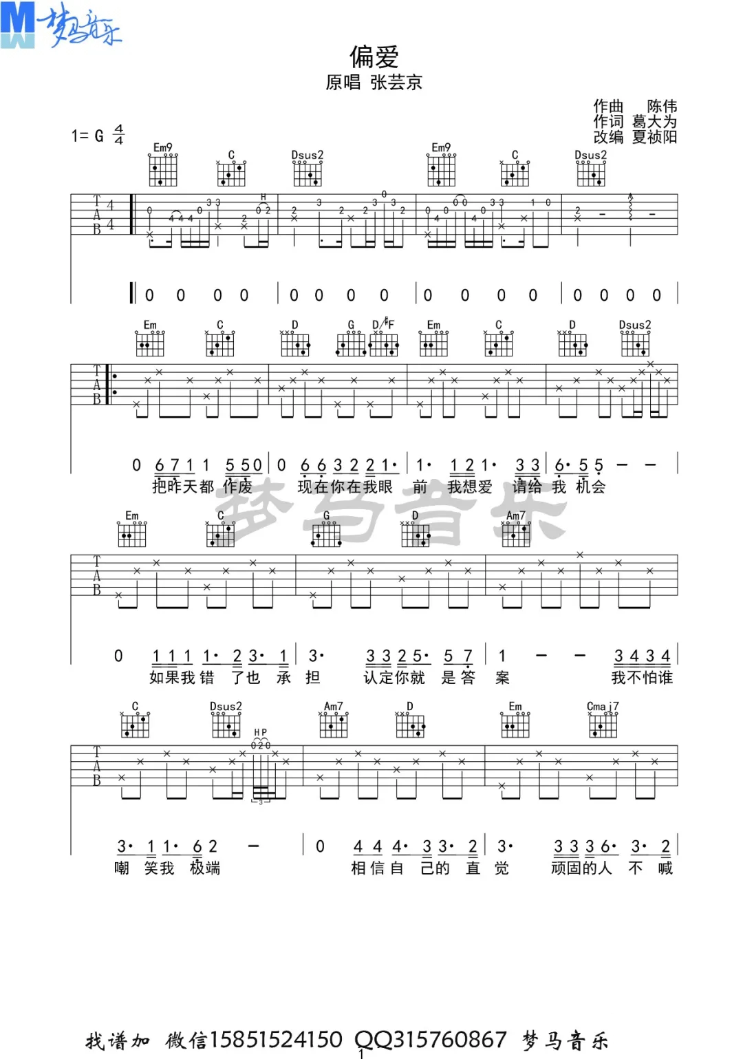 曲谱介绍: 吉他谱介绍:偏爱吉他谱,张芸京演唱的一首歌曲,4/4拍的节奏,这首歌曲的原调为A调,这里曲谱采用了G调指法进行编配,演唱时夹变调夹2品可回到原调,也可根据个人实际嗓音情况选择。曲谱由琴谱网更新上传,共3张高清图片弹唱吉他谱例,来源于@梦马音乐编配出品。来自张芸京的一首歌曲,这首歌也是电视剧《仙剑奇侠传三》的插曲,非常好听的一首歌。吉他谱的吉他部分还是比较简单的,但前奏需要多练习,整体感觉和张芸京版本的歌曲差不多。