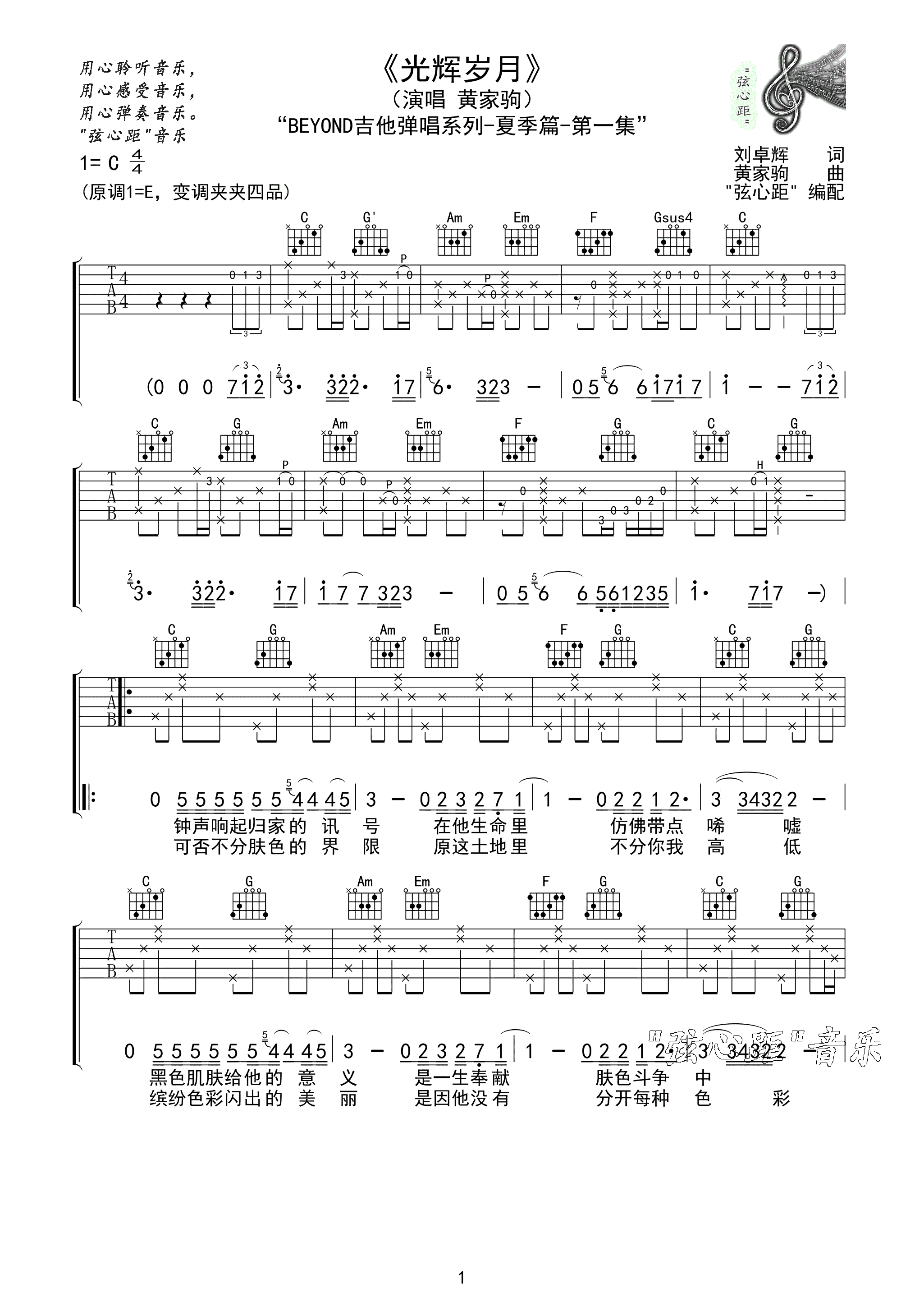 曲谱介绍: 吉他谱介绍:光辉岁月吉他谱,Beyond演唱的一首歌曲,4/4拍的节奏,这首歌曲的原调为E调,这里曲谱采用了C调指法进行编配,演唱时可不夹变调夹,曲谱由琴谱网更新上传,共2张高清图片弹唱吉他谱例,来源于@弦心距编配出品。“今天只有残留的躯壳,迎接光辉岁月”,一首来自Beyond经典的粤语歌曲,听到的都是青春,都是回忆。