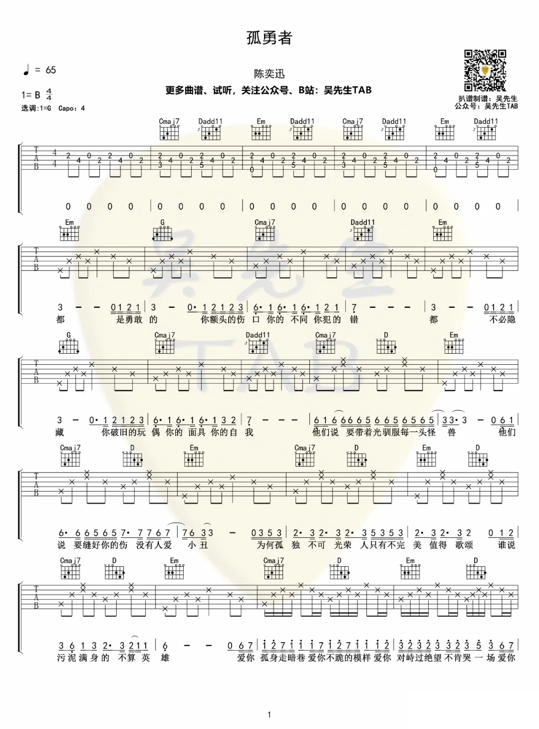 曲谱介绍: 吉他谱介绍:孤勇者吉他谱,陈奕迅演唱的一首歌曲,4/4拍的节奏,这首歌曲的原调为B调,这里曲谱采用了G调指法进行编配,演唱时夹变调夹4品可回到原调,也可根据个人实际嗓音情况选择。曲谱由琴谱网更新上传,共3张高清图片弹唱吉他谱例,来源于@吴先生TAB编配出品。这首歌是英雄联盟动画《英雄联盟:双城之战》的中文主题曲,这个版本的吉他谱编配难度适中,练习要点主要在于前奏间奏尾奏,还有拍弦技巧的掌握。