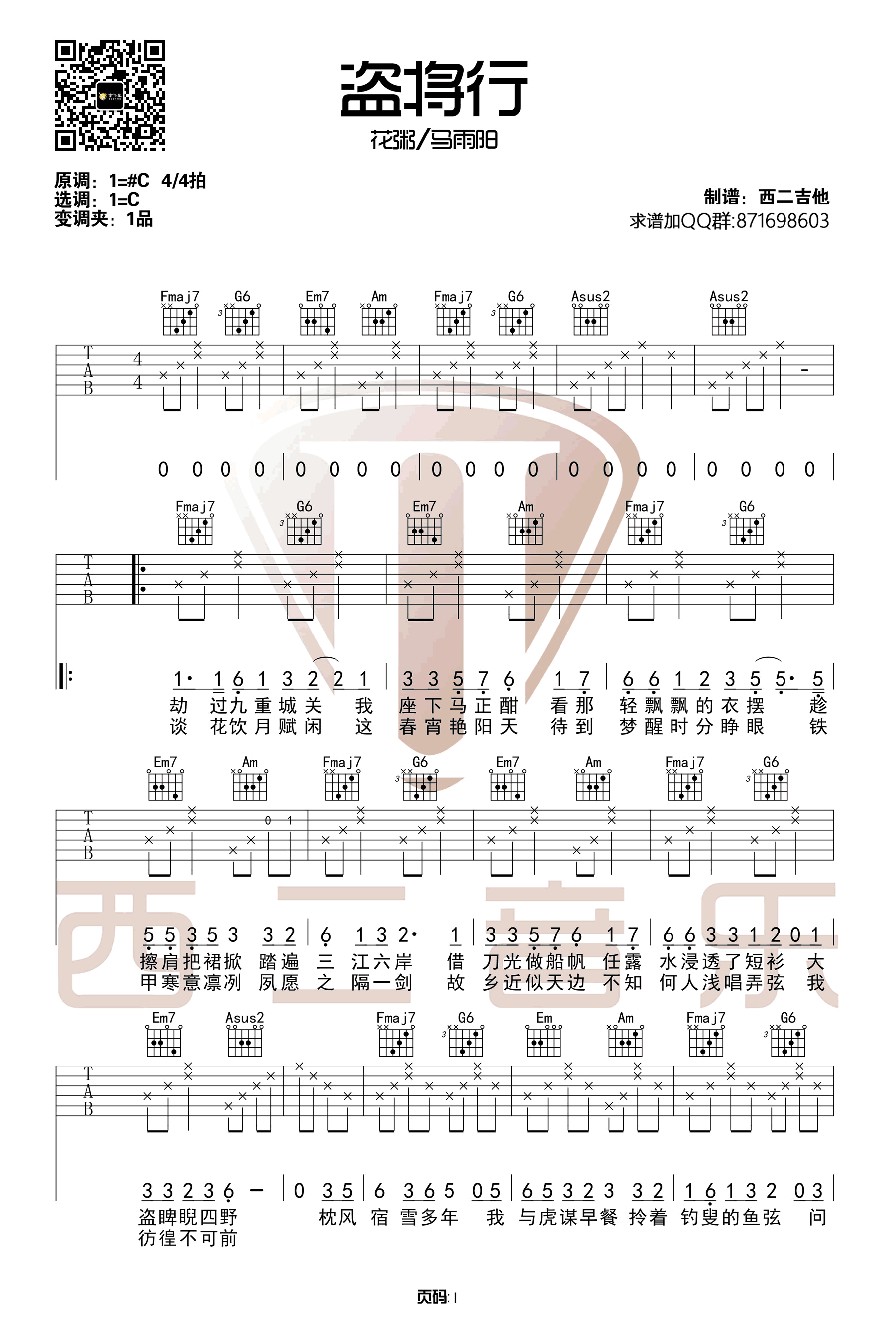 盗将行吉他谱 - 花粥/马雨阳 - C调吉他弹唱谱 - 原版