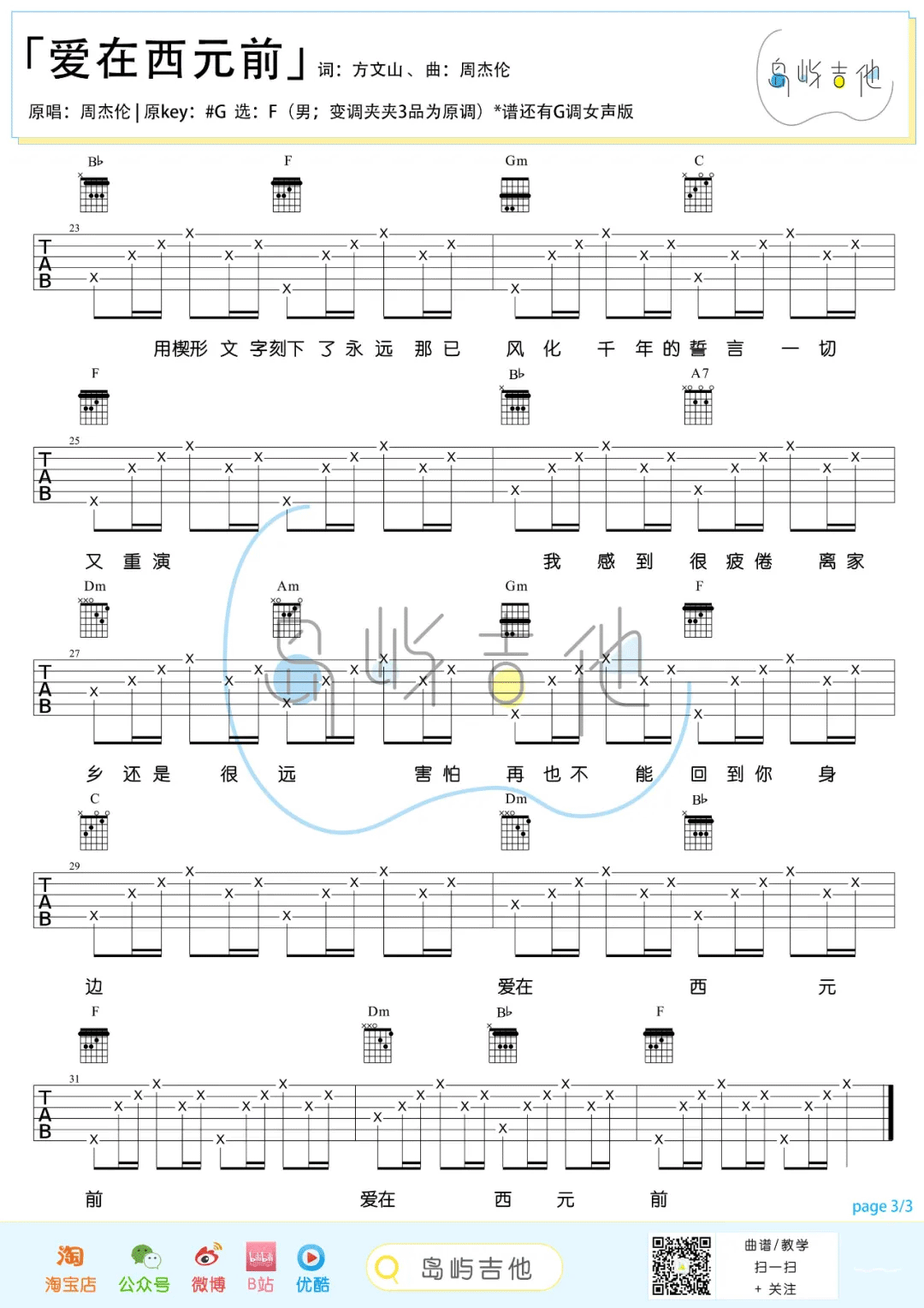 曲谱介绍: 吉他谱介绍:爱在西元前吉他谱,周杰伦演唱的一首歌曲,4/4拍的节奏,这首歌曲的原调为降A调,这里曲谱采用了F调指法进行编配,演唱时夹变调夹3品可回到原调,也可根据个人实际嗓音情况选择。曲谱由琴谱网更新上传,共3张高清图片弹唱吉他谱例,来源于@岛屿吉他编配出品。这首歌已经发布多年,但如今听起来一点都不感到过时,也是杰伦逛完博物馆后有感而发写下的一首歌。这里采用的F调指法,存在较多大横按,所以在和弦上有些难度,但节奏型却是十分简单的。