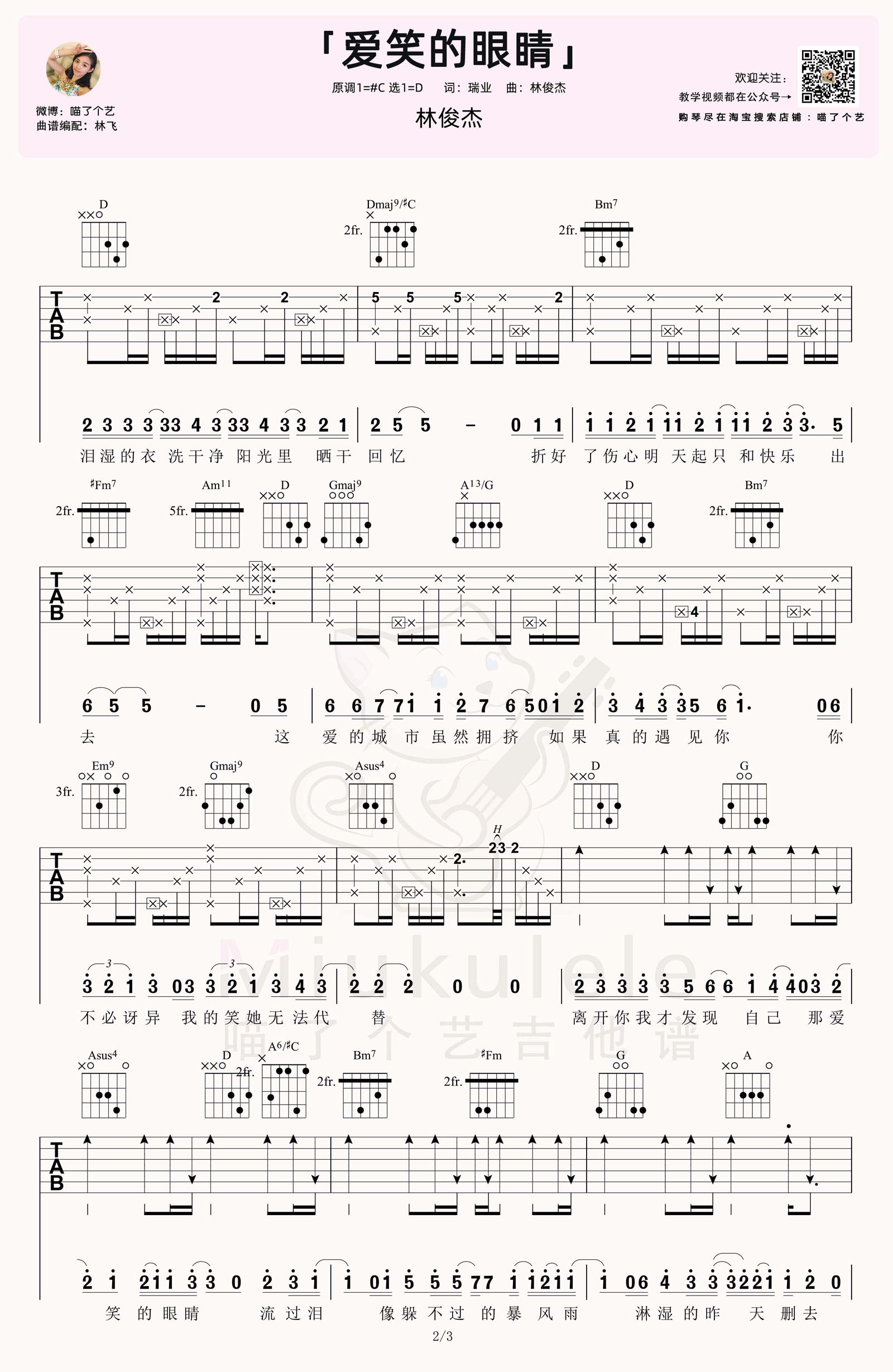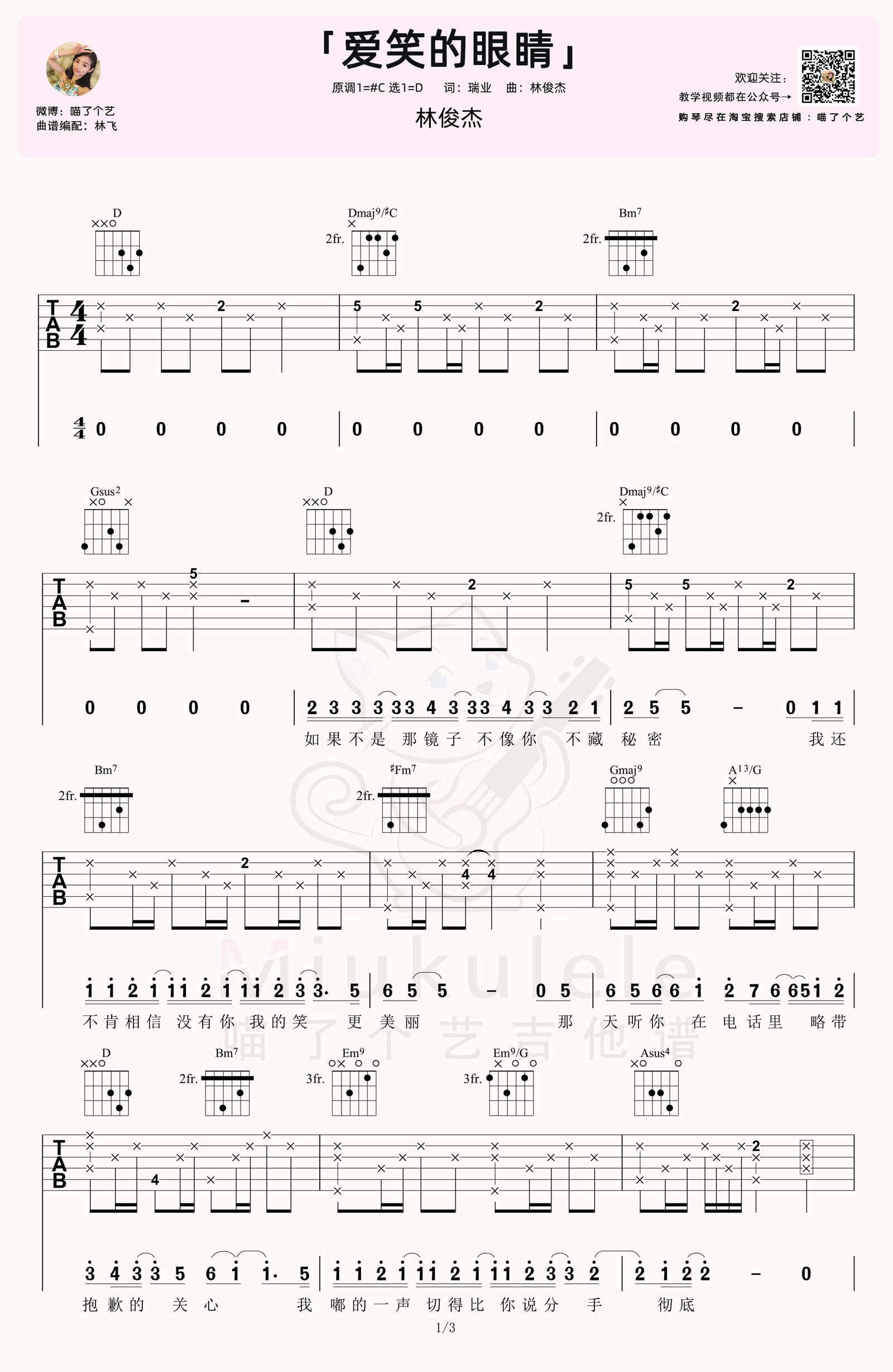 曲谱介绍: 吉他谱介绍:爱笑的眼睛吉他谱,林俊杰演唱的一首歌曲,4/4拍的节奏,这首歌曲的原调为#C调,这里曲谱采用了D调指法进行编配,演唱时可根据个人情况选择变调夹,曲谱由琴谱网更新上传,共3张高清图片弹唱吉他谱例,来源于@喵了个艺编配出品。“离开你我才发现自己,那爱笑的眼睛”,十分辛酸的一句歌词,来自林俊杰创作的经典情歌。这首歌其实徐若瑄演唱过,两个人各有特色。这里的吉他谱D调编配,比较适合女嗓演唱,男生演唱可以选择其他C调版本。 爱笑的眼睛吉他弹唱教学