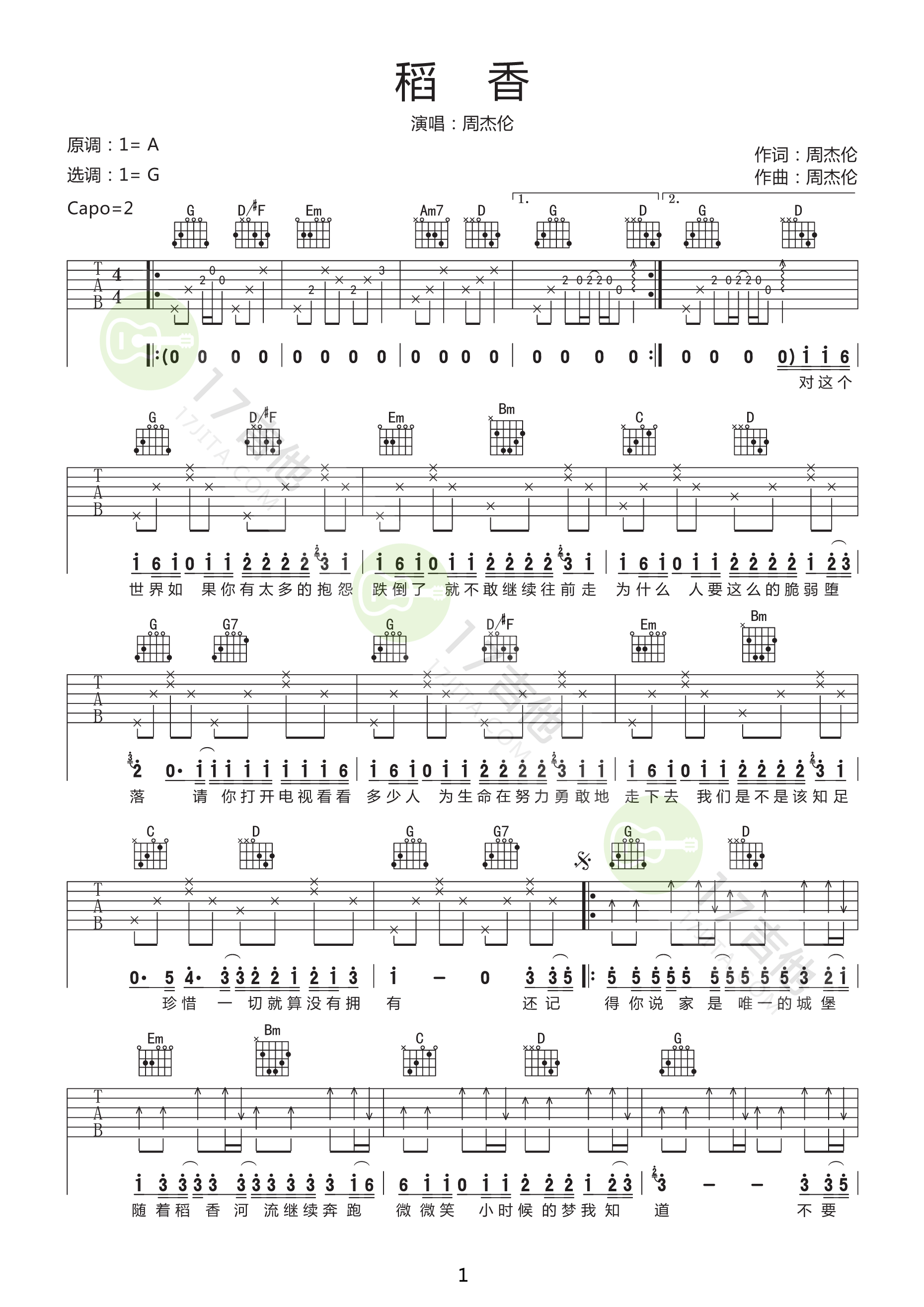 曲谱介绍: 吉他谱介绍:稻香吉他谱,周杰伦演唱的一首歌曲,4/4拍的节奏,这首歌曲的原调为A调,这里曲谱采用了G调指法进行编配,演唱时夹变调夹2品可回到原调,也可根据个人实际嗓音情况选择。曲谱由琴谱网更新上传,共3张高清图片弹唱吉他谱例,来源于@17吉他编配出品。这是一首很经典的歌曲,旋律好听朗朗上口,歌词积极向上,如果你身处逆境,不如听听这首歌,你会重新振作起来。