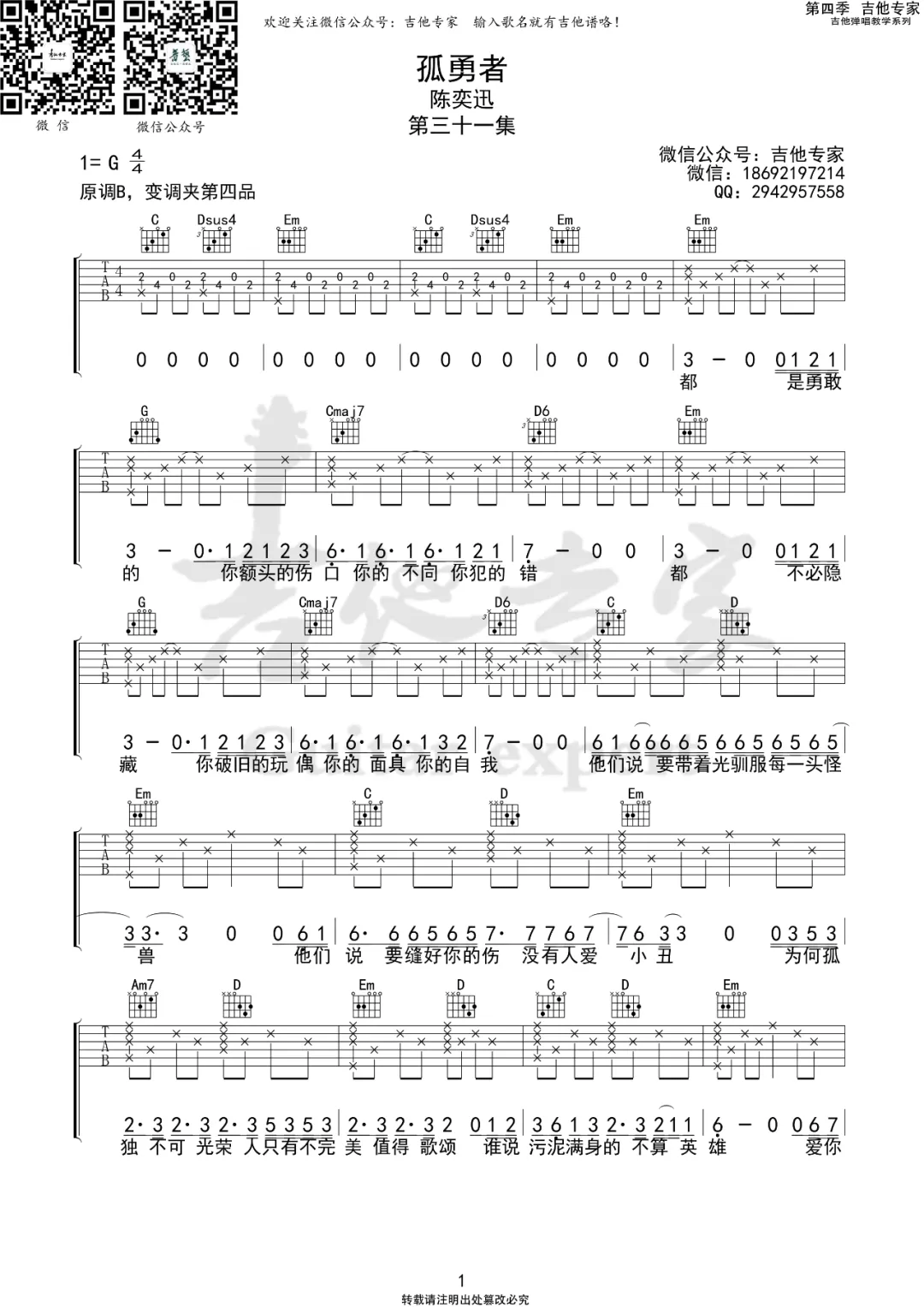 曲谱介绍: 吉他谱介绍:孤勇者吉他谱,陈奕迅演唱的一首歌曲,4/4拍的节奏,这首歌曲的原调为B调,这里曲谱采用了G调指法进行编配,演唱时夹变调夹4品可回到原调,也可根据个人实际嗓音情况选择。曲谱由琴谱网更新上传,共3张高清图片弹唱吉他谱例,来源于@吉他专家编配出品。这是一首来自陈奕迅演唱的《英雄联盟双城之战》的主题曲,这首歌表现了两个人为了活下去而不得不去战斗的一面。这个版本的吉他谱编配比较还原,但整体难度不大。