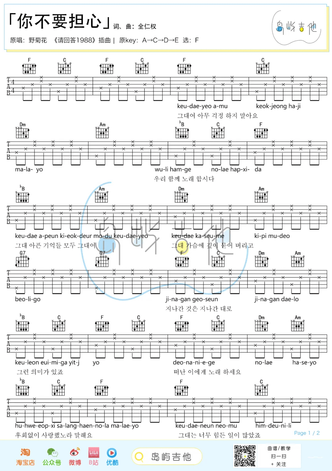 曲谱介绍: 吉他谱介绍:你不要担心吉他谱,野菊花乐队演唱的一首歌曲,4/4拍的节奏,这首歌曲的原调为F调,这里曲谱采用了F调指法进行编配,演唱时可不夹变调夹,曲谱由琴谱网更新上传,共2张高清图片弹唱吉他谱例,来源于@岛屿吉他编配出品。这是一首十分温馨的歌曲,是韩剧《请回答1988》的插曲。这里编配采用的是F调指法,和弦有点难度,特别是其中的降B和弦,但节奏型非常简单。另外这首歌原曲转调非常多,但这里未编配转调部分。