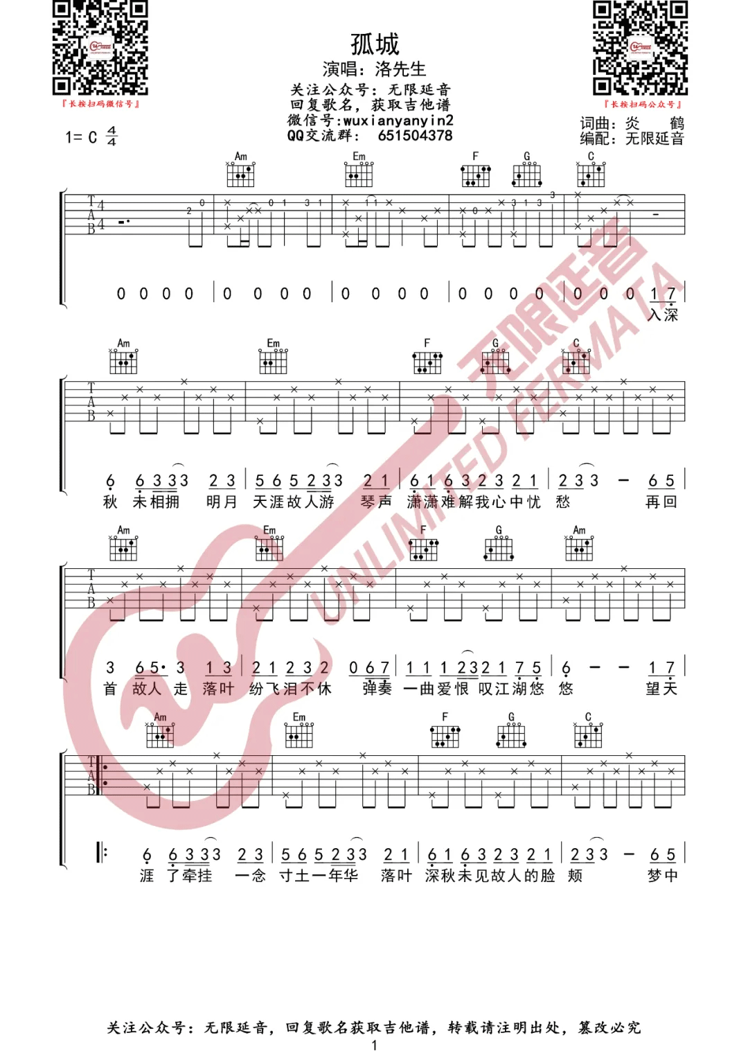 曲谱介绍: 吉他谱介绍:孤城吉他谱,洛先生演唱的一首歌曲,4/4拍的节奏,这首歌曲的原调为C调,这里曲谱采用了C调指法进行编配,演唱时可不夹变调夹,曲谱由琴谱网更新上传,共3张高清图片弹唱吉他谱例,来源于@无限延音编配出品。这首歌是网络上非常火的一首古风歌曲,前奏间奏和尾奏编配的也不难,其他部分更加简单,好听又好学。