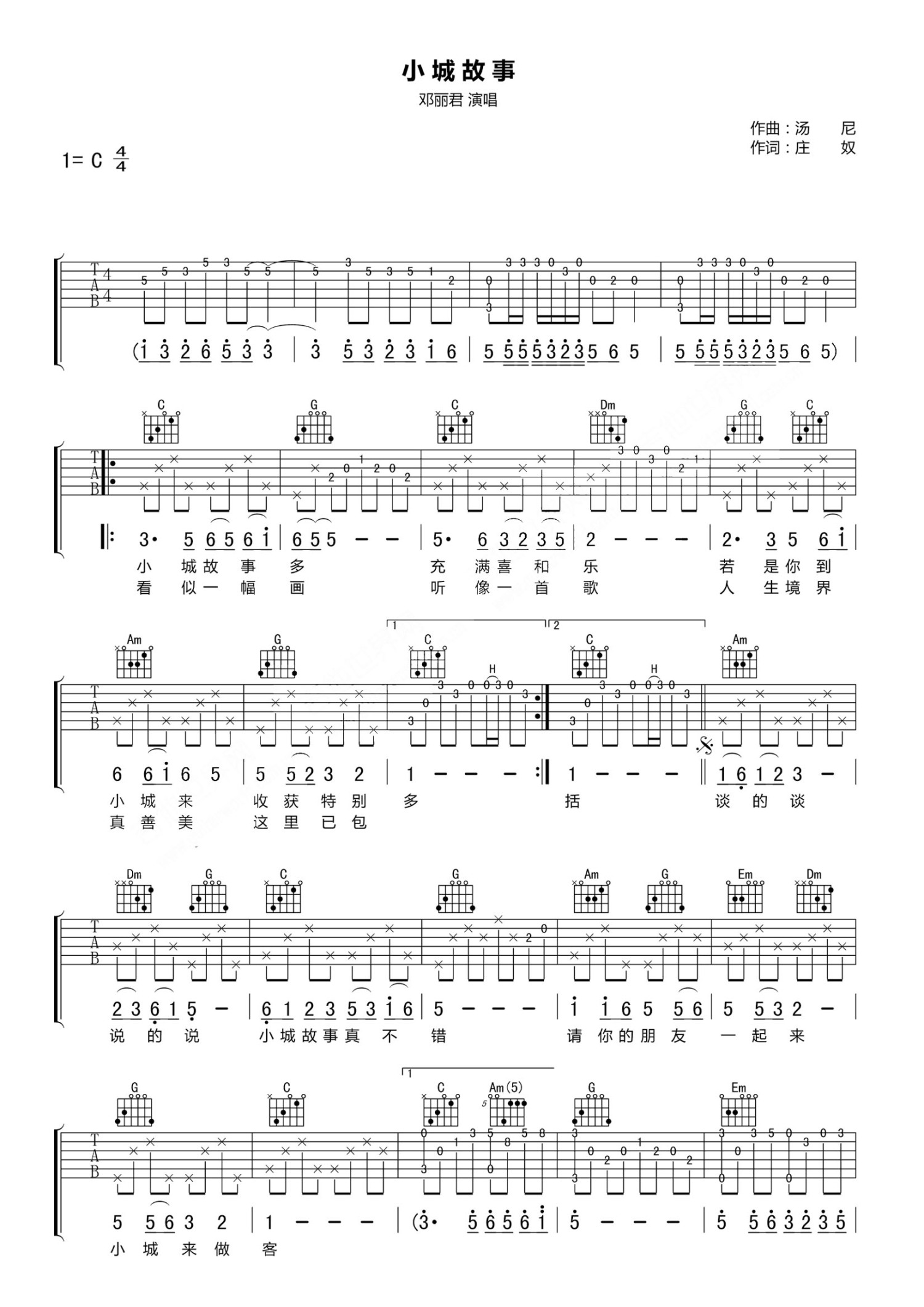 曲谱介绍: 邓丽君《小城故事》吉他谱C调弹唱吉他谱