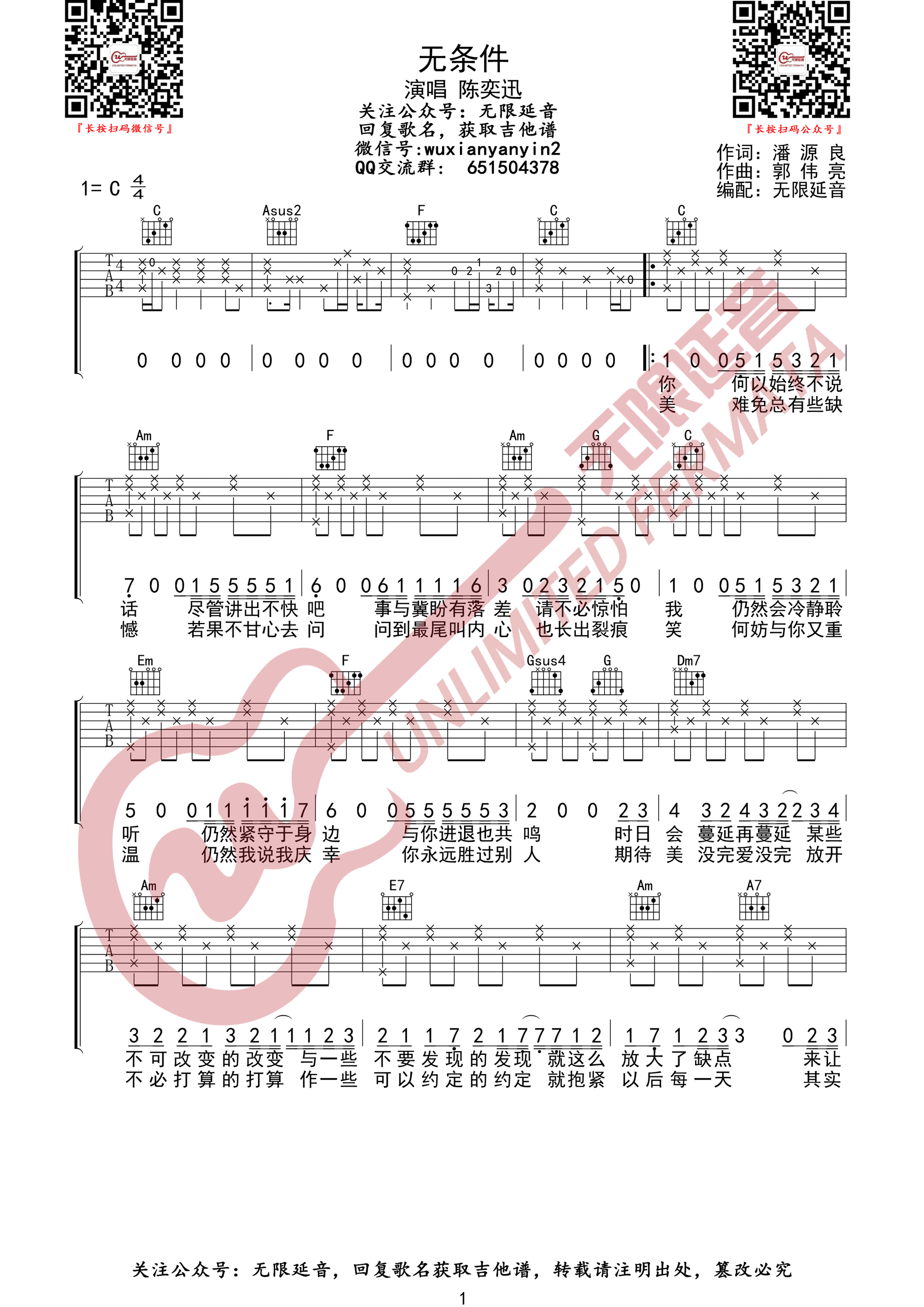 曲谱介绍: 吉他谱介绍:无条件吉他谱,陈奕迅演唱的一首歌曲,4/4拍的节奏,这首歌曲的原调为C调,这里曲谱采用了C调指法进行编配,演唱时可不夹变调夹,曲谱由琴谱网更新上传,共2张高清图片弹唱吉他谱例,来源于@无限延音编配出品。这是一首来自陈奕迅的经典粤语歌曲,很有意境的一首歌,每当听到的时候都会想起一个人。