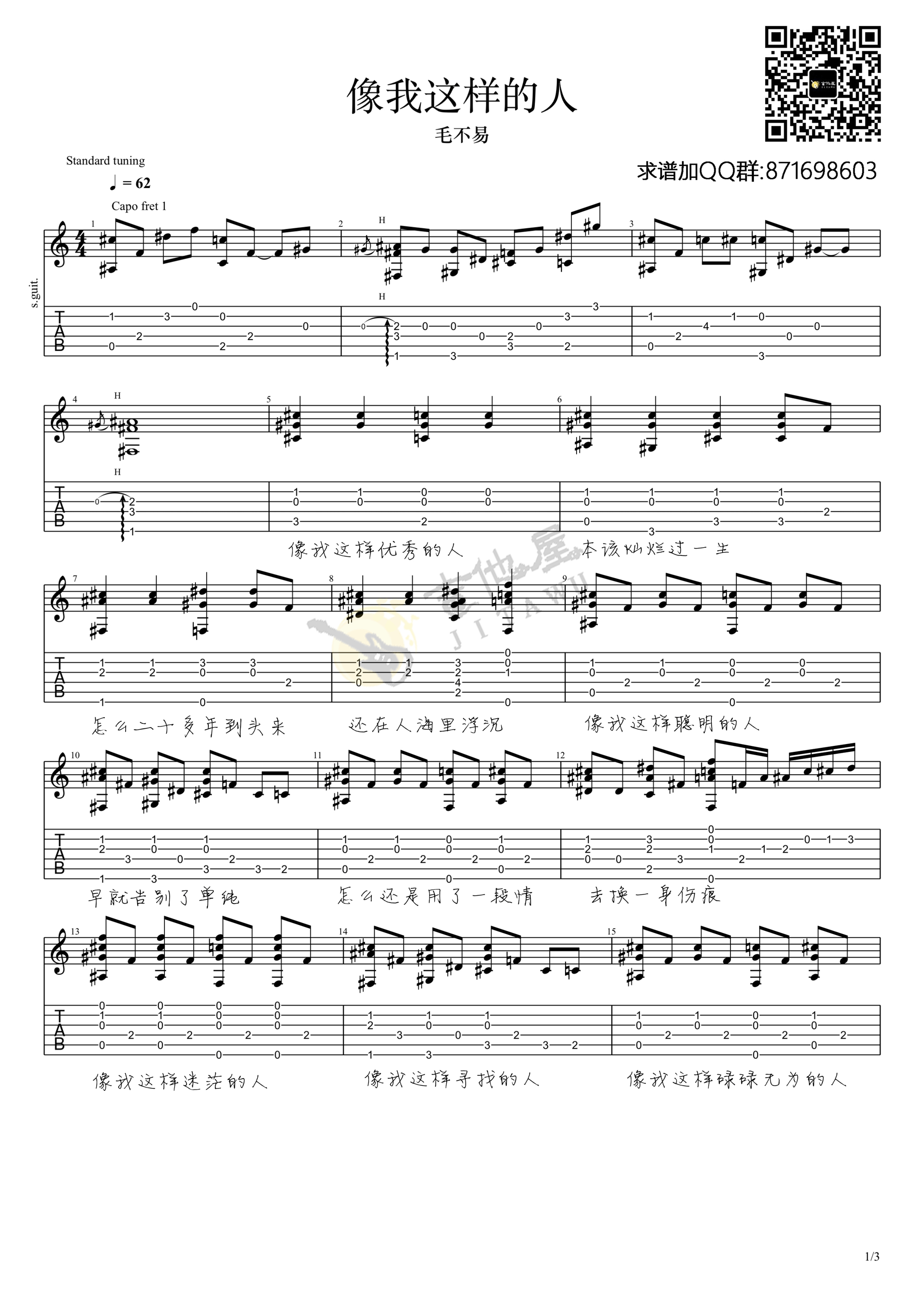 曲谱介绍: 吉他谱介绍:像我这样的人吉他谱,毛不易演唱的一首歌曲,4/4拍的节奏,这首歌曲的原调为#C调,这里曲谱采用了C调指法进行编配,演唱时夹变调夹1品可回到原调,也可根据个人实际嗓音情况选择。曲谱由琴谱网更新上传,共3张高清图片弹唱吉他谱例,来源于@小NO师傅编配出品。小NO老师是一位指弹水平非常高的吉他爱好者,这里是他所编配制谱的毛不易《像我这样的人》吉他谱,还原度可以说非常高了,难度一般。 像我这样的人吉他弹唱教学